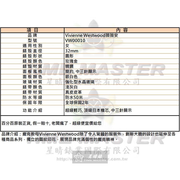 Vivienne Westwood手錶,編號VW00010,32mm玫瑰金錶殼,淺灰白錶帶款