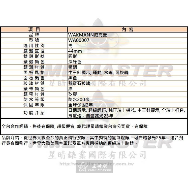 WAKMANN手錶,編號WA00007,44mm深綠色錶殼,綠錶帶款