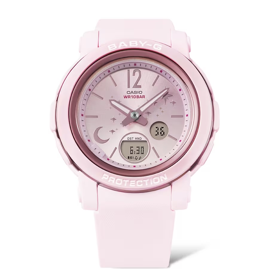 呼喚所有觀星者!沉浸自身至閃耀群星和月亮光輝之中。 輕巧的BGA-290提供易讀的寬型錶面,其漸層的色調令人聯想到夜空。錶圈經過蒸鍍處理,呈現美麗的金屬光澤。夜空象徵著好運,而月亮和星辰分別有成長和快樂的含意。 具備耐衝擊構造和防水100米性能,此錶款兼具實用性和迷人魅力。只需傾斜手錶,即可閃耀星光。