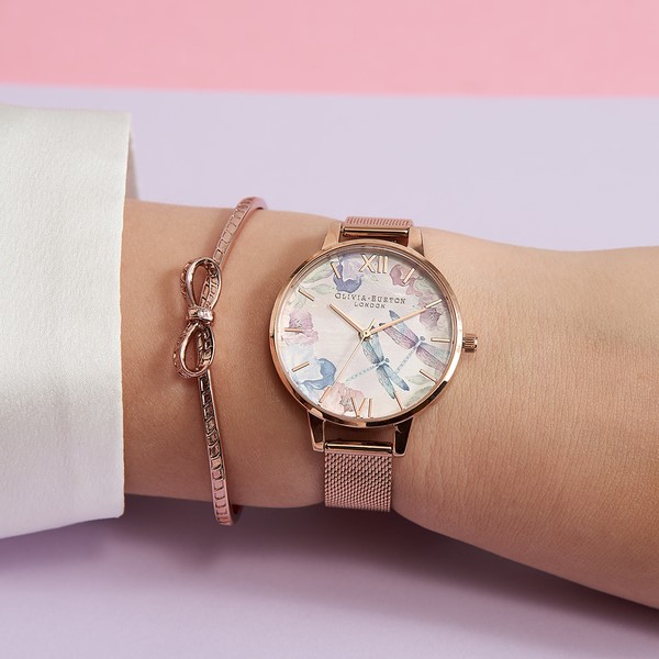 【高雄時光鐘錶】 Olivia Burton OB16PP83 花繪系列 玫瑰金殼 彩繪蜻蜓 嫣粉皮帶 腕錶