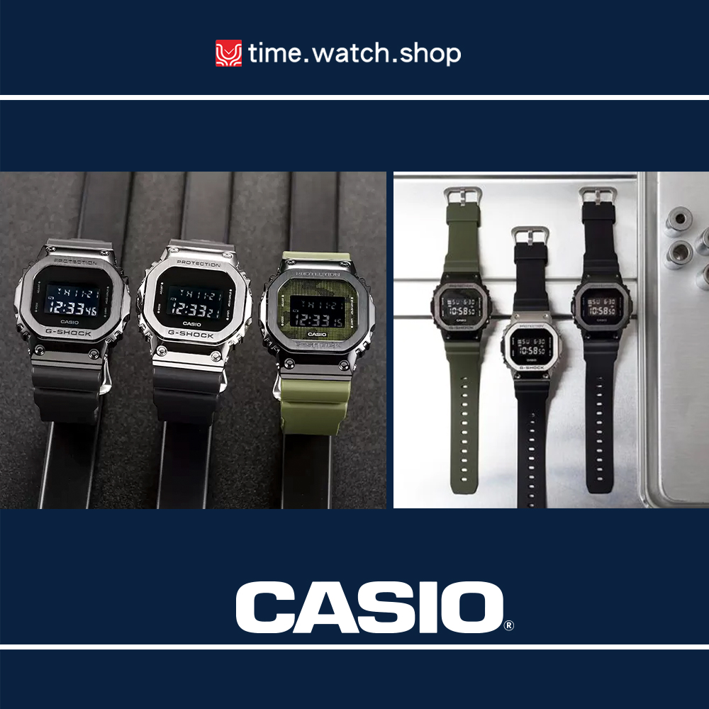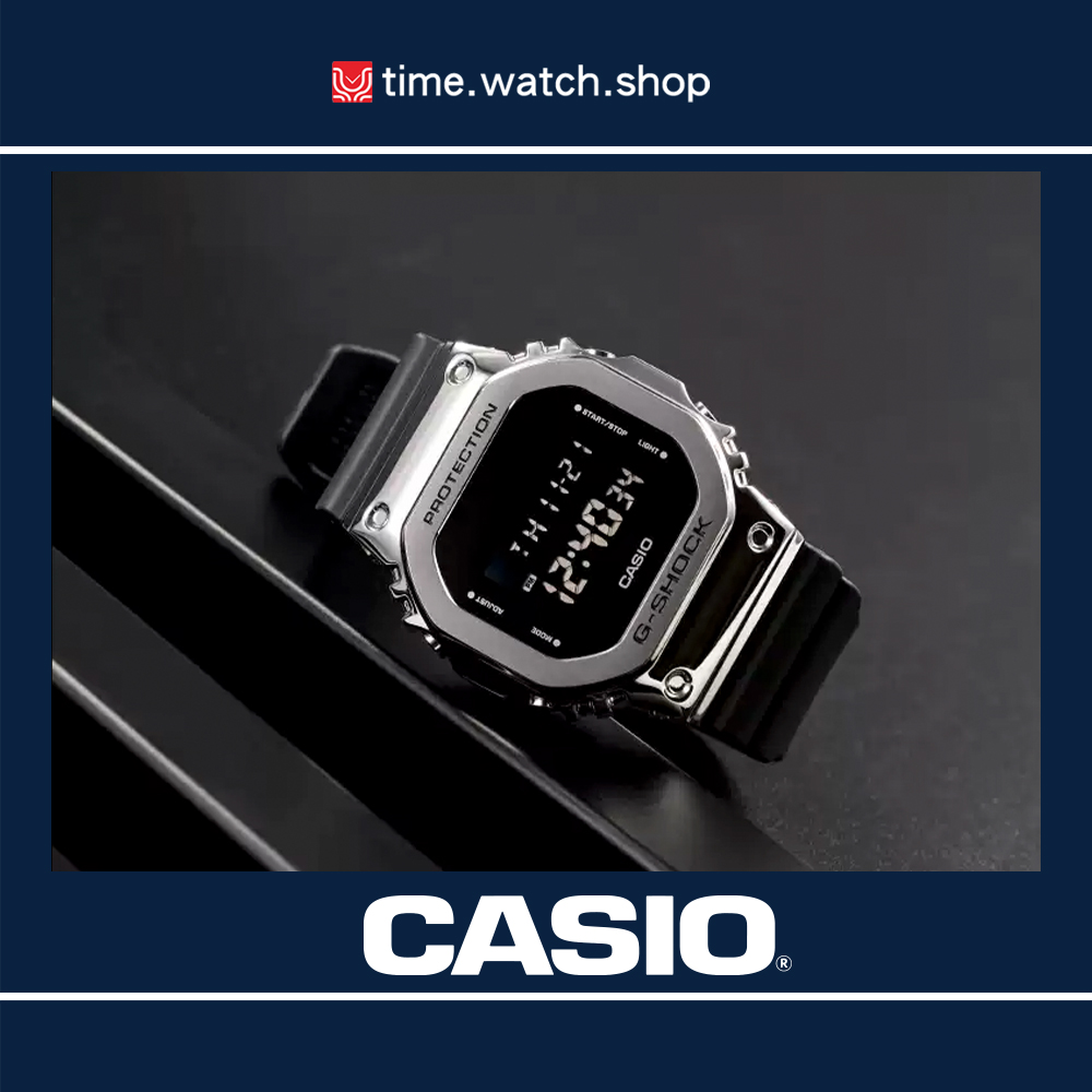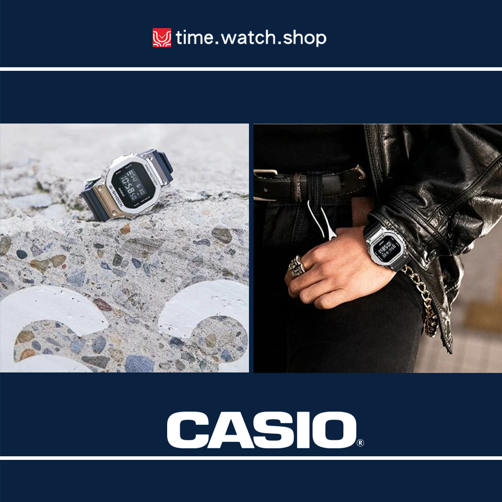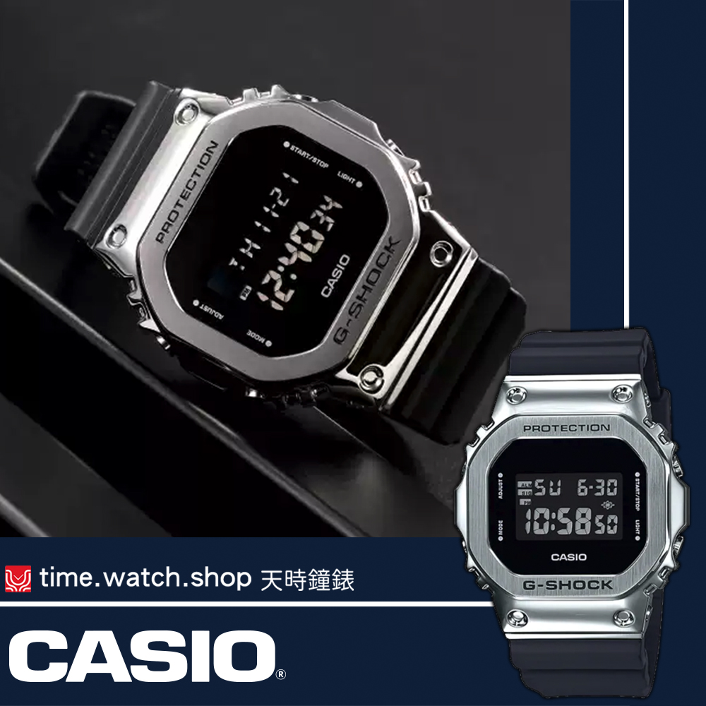 G-SHOCK 超人氣DW-5600系列 金屬質感的不鏽鋼錶殼 輕巧又貼合手腕的舒適樹脂錶帶 G-SHOCK經典錶款5600系列再推新款式GM-5600系列, 維持經典的方型錶殼,換上金屬質感的不鏽鋼錶殼, 搭配輕巧又貼合手腕的舒適樹脂錶帶,黑色樹脂錶帶可搭配銀、黑兩色的錶殼, 而墨綠色錶帶搭配黑色錶殼外,錶盤特別設計點陣迷彩紋路, 三款皆搭配黑色反轉液晶螢幕顯示,營造出G-SHOCK一貫時尚的外觀。 維持既有的耐衝擊構造與防水200米外,搭載1/100秒碼表、倒數計時、鬧鈴、 全自動月曆與EL冷光照明…等多元機能。