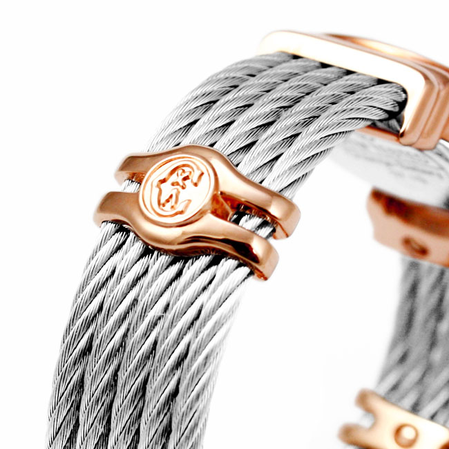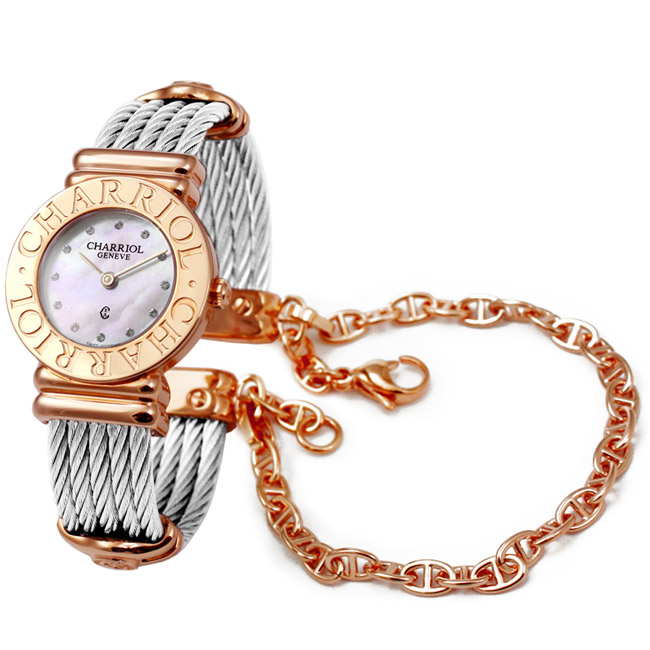 St-Tropez手錶-24.5毫米5N玫瑰金鍍金錶殼-白色珍珠貝母錶盤搭配12氧化鋯-不銹鋼纜繩錶帶-瑞士石英機芯。 可調大小。 備受喜愛的ST-TROPEZ®手錶系列帶您前往法國里維埃拉(River Riviera)曬太陽。這款漂亮的瑞士製造石英鐘錶散發女性魅力,在錶帶上飾有我們標誌性的編織纜繩圖案,以及一個額外的鍊式手鍊,為設計增添了獨特的珠寶氣息。它充滿了優雅和精緻,採用玫瑰金鍍層和不銹鋼製成,並帶有白色珍珠母貝錶盤,並飾有12顆氧化鋯石。一款經典的女士手錶,彰顯了Charriol的藝術風格。可以調節尺寸以找到最合適的穿著,錶帶的防過敏效果。