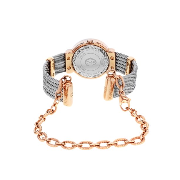 備受喜愛的ST-TROPEZ®手錶系列帶您前往法國里維埃拉(River Riviera)曬太陽。這款漂亮的瑞士製造石英鐘錶散發女性魅力,在錶帶上飾有我們標誌性的編織纜繩圖案,以及一個額外的鍊式手鍊,為設計增添了獨特的珠寶氣息。玫瑰金鍍金和精鋼製成,充滿優雅和精緻,白色珍珠母貝錶盤,表圈上飾有拋光羅馬數字。一款經典的女士手錶,彰顯了Charriol的藝術風格。可以調節尺寸以找到最合適的穿著,錶帶的防過敏效果。