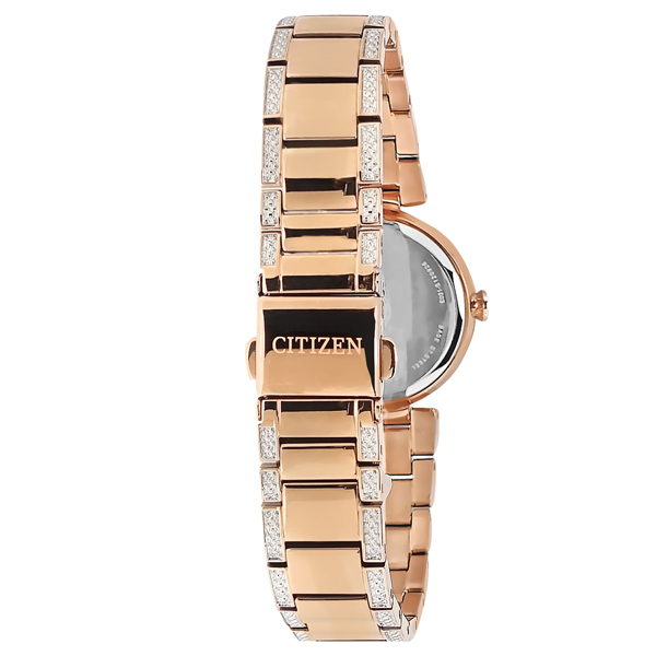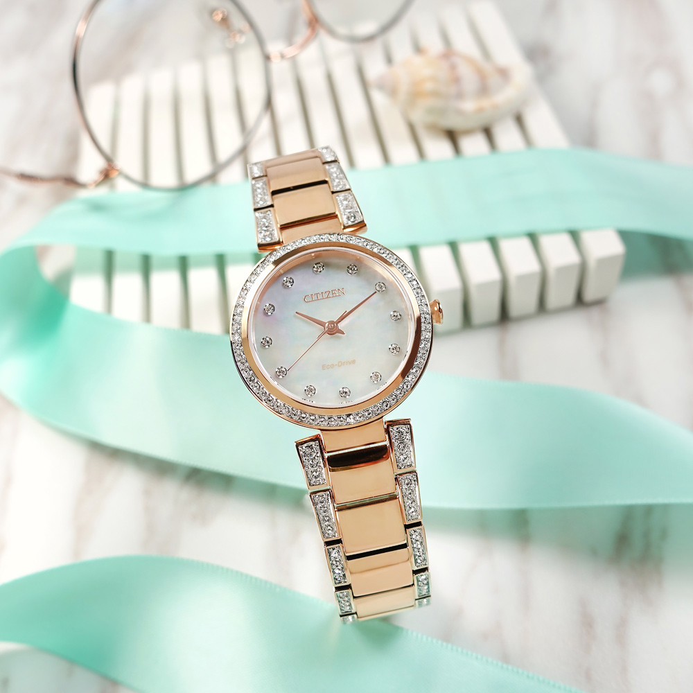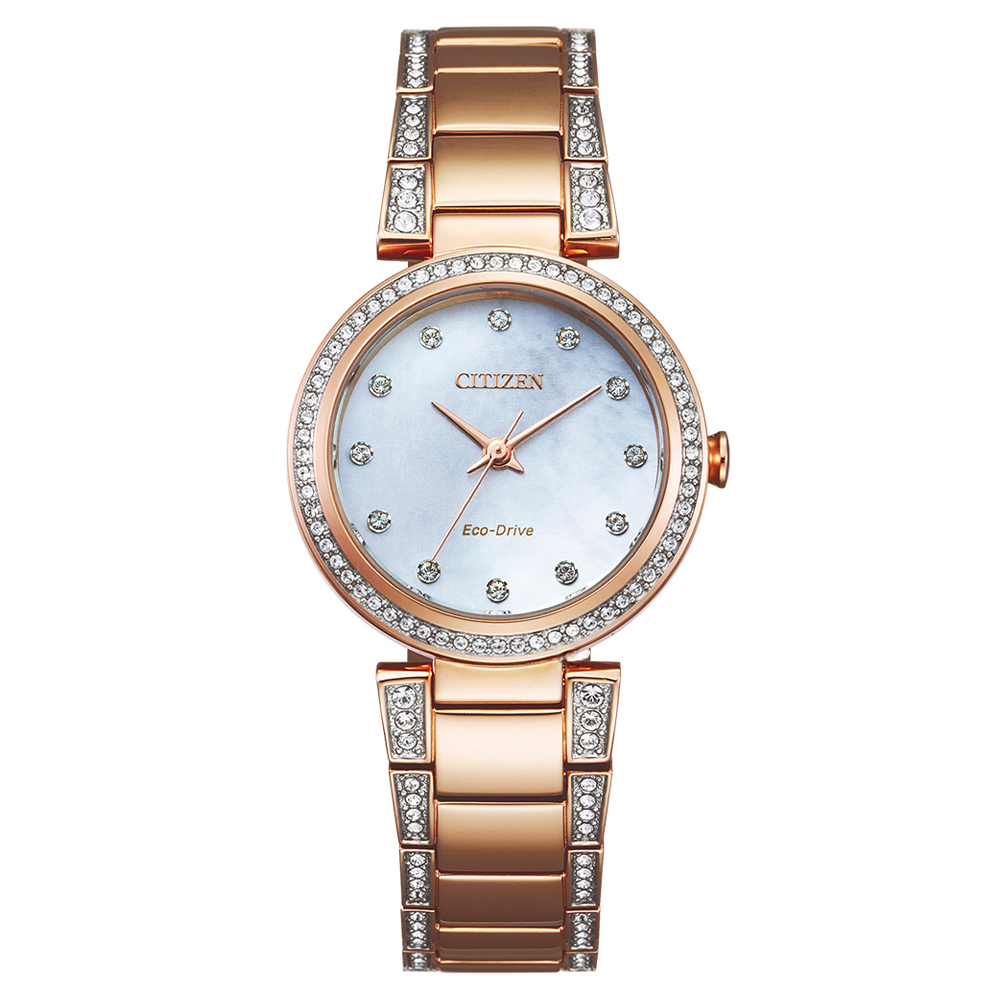 全不鏽鋼材質錶殼、錶帶,環保光動能蓄電,簡約三針設計, 貝母錶盤點綴12顆晶鑽。 錶殼外圈鑲嵌64顆晶鑽,錶帶飾有76顆晶鑽, 優雅中帶點奢華。展現令人出乎意料的魅力風情。 CITIZEN 星辰 LADY'S 奢華綻放 光動能時尚錶 輕時尚, CITIZEN女性腕錶系列,簡約大方的設計 ,是CITIZEN 女錶系列最明顯的標記,錶款機芯總類齊全, 搭載光動能或者自動上鍊機芯,讓女性無倫在任何場合都能夠綻放無限的優雅自信。