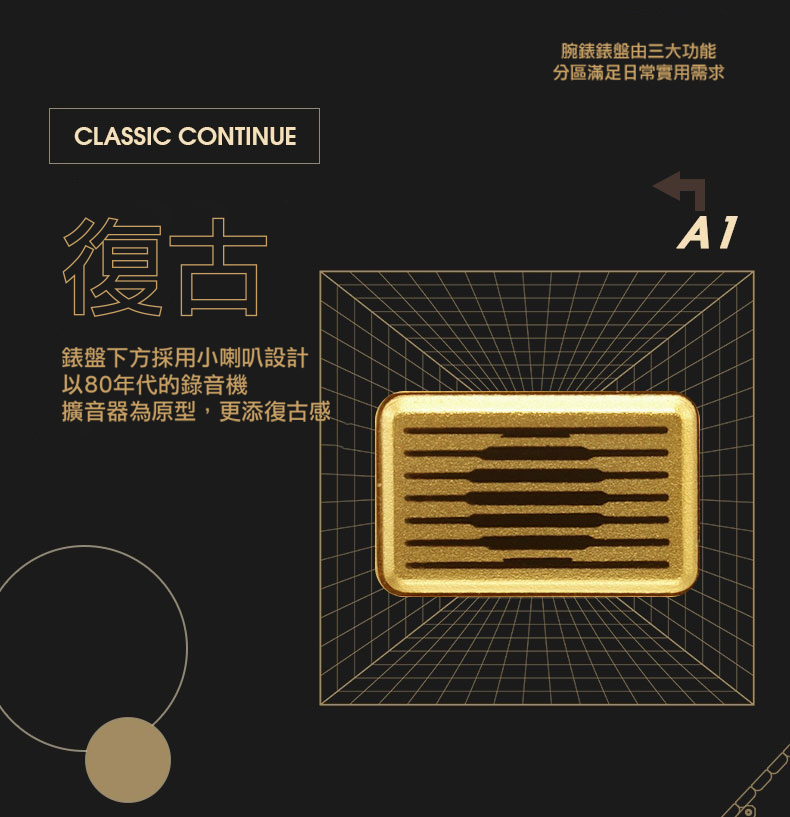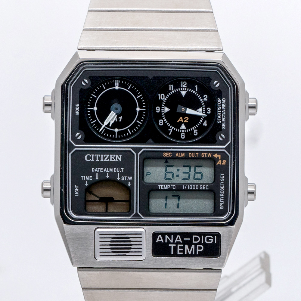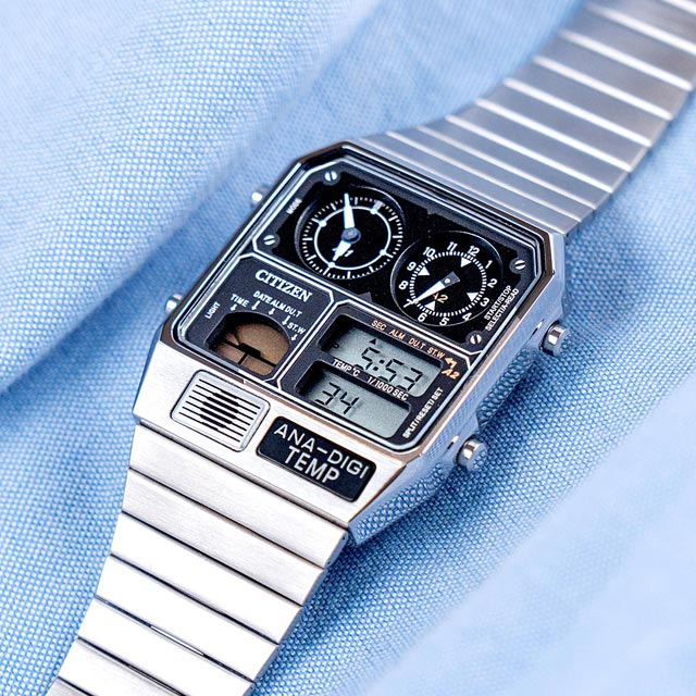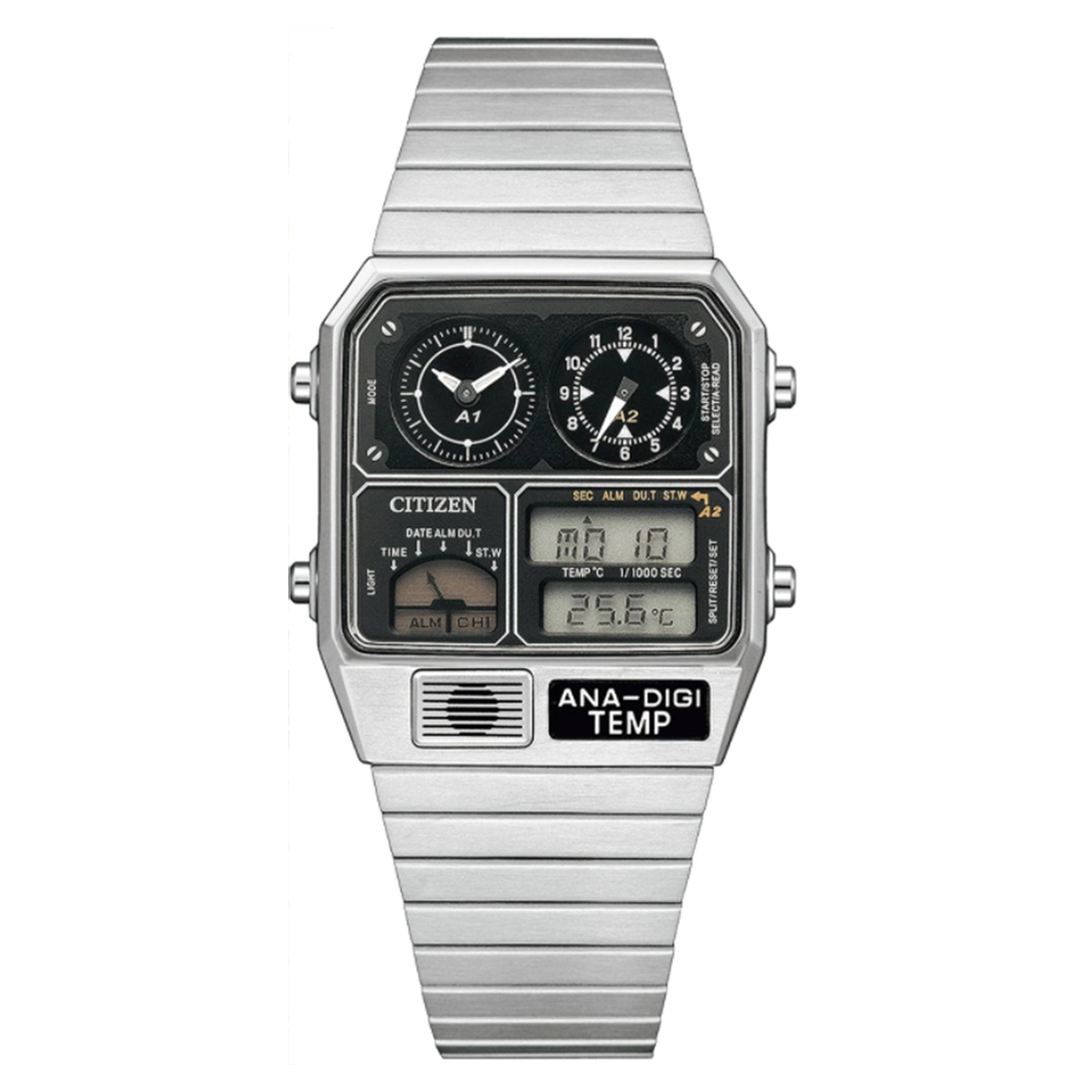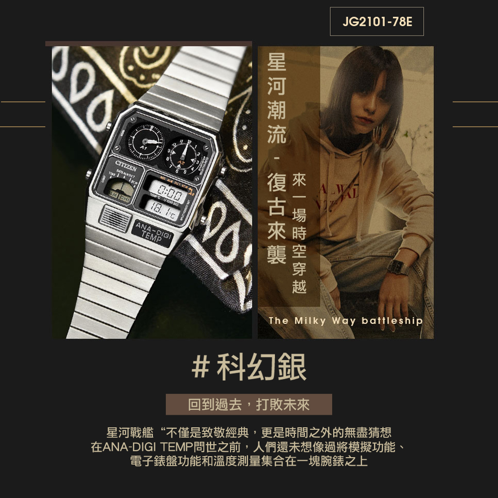 1982年,CITIZEN推出一款兼具指針顯時(ANA)、數位顯時(DIGI)及溫度計測(TEMP)於一體的腕錶,在當時復古未來主義的時代氛圍下大受好評。時至今日,承襲至經典腕錶設計的ANA-DIGI TEMP,維持復刻的方型不鏽鋼錶殼,復古的金屬錶帶設計不僅舒適好配戴更能隨時輕鬆調整錶帶長度。 本次推出全新三款配色:「太空黑」JG2105-93E、「復古金」JG2103-72X 、「時尚銀」JG2101-78E 以過去對未來的想像作為靈感,ANA-DIGI TEMP在錶面上方維持常見的指針顯時之外,下方的數位顯時並行更增添未來感。同樣採用數位顯示的模式選單,快速切換溫度計測、兩地時間顯示、計時碼錶等多樣功能,讓玩賞腕錶之際增添如同操縱宇宙飛船面板的體驗,此外另有實用的電池壽命電源警告功能,當手錶電力即將耗盡時,A2的秒針盤將會以兩秒一跳的方式或數位顯示的時間時與分中間的“:”閃爍提醒佩戴者,輕鬆掌握腕錶電量。這款腕錶不僅具備實用功能,更創造出80年代復古未來主義與新潮腕錶結合的絕佳風格。