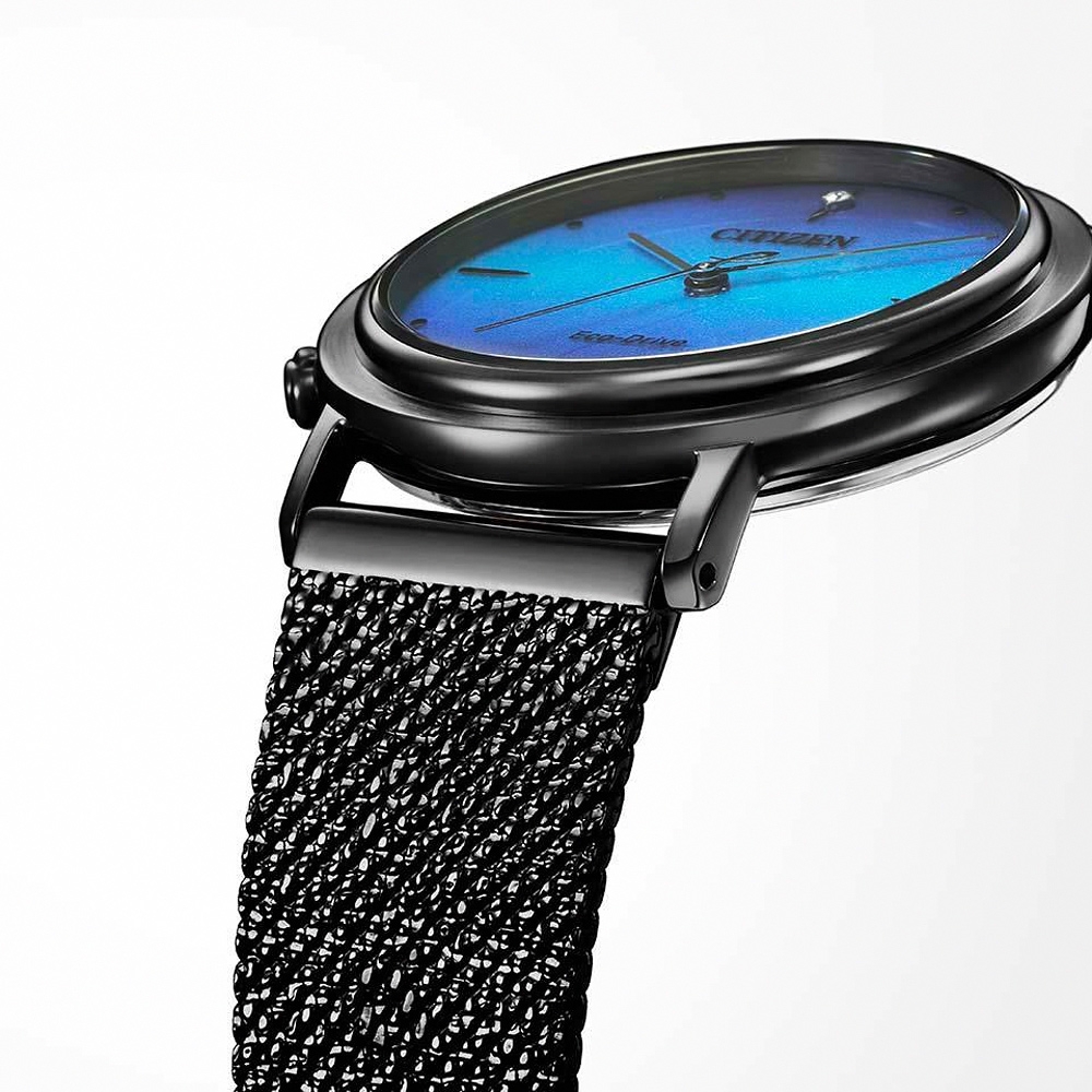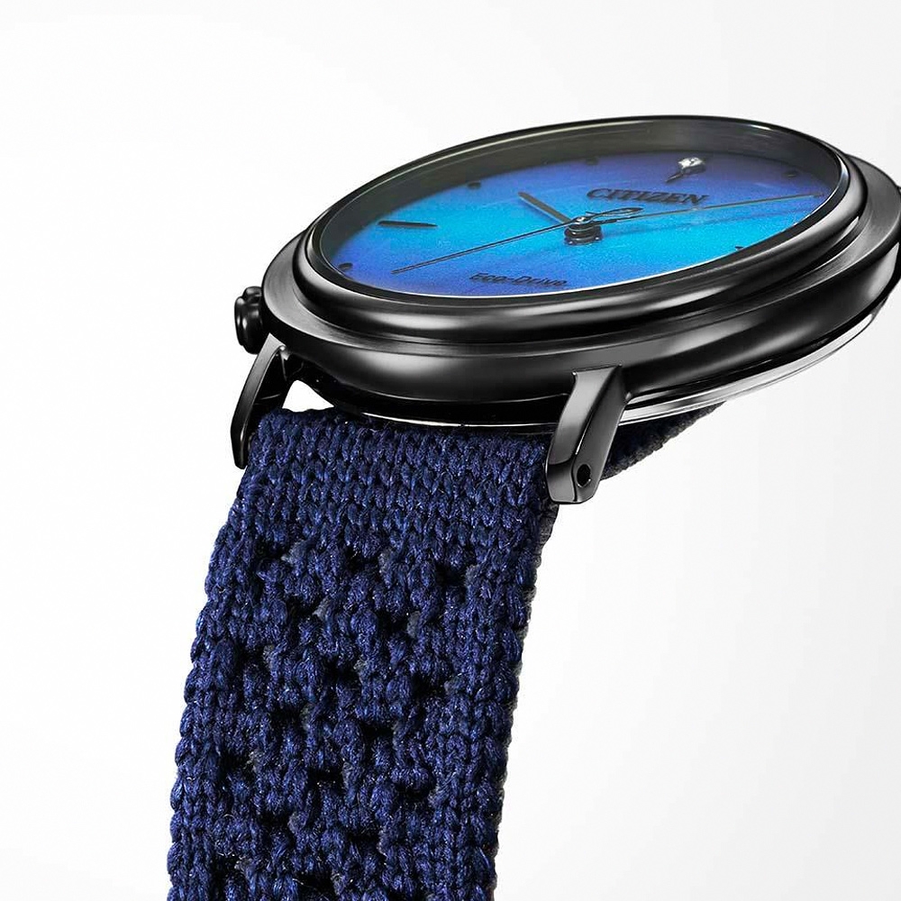 Eco-Drive 環保光動能,靈感來自四大元素中的水 1顆實驗室鑽石鑲嵌,環保ECOPET®錶帶 球面藍寶石玻璃鏡面,附贈乙條米蘭錶帶 設計靈感來自四大元素—水 充分體現了地球自然之美及其孕育萬物生命的自然力量 設計過程由生物學家 Shin-Ichi Fukuoka 博士親自監督 設計結合了仿生學原理,從生物的結構和自然之美中汲取靈感 創造出更完美的手錶,外觀漂亮且佩戴舒適 錶盤鑲嵌一顆實驗室鑽石,搭配輕便舒適的ECOPET®聚酯纖維材質針織錶帶 WHOLEGARMENT®針織技術,製成可手洗的材質 紋理為多孔結構,具有出眾的伸縮性和耐用性 模仿大海海綿的多孔結構設計,可輕鬆排汗 結構生色是自然界中的一種特殊現象,創造出奇妙的色彩 如大藍閃蝶和吉丁蟲翅膀上的絢麗顏色,當具有特定波長的光線照射至微結構時,結構色就會顯現 這種效果由 FUJIFILM 公司開發的結構色墨水產生,這也是此種特殊墨水首次用於鐘錶行業 錶盤通過反射光線,在光線照射到錶盤時就會產生自然絢麗的色彩 Eco-Drive 光動能是CITIZEN高科技的代表作 引以為傲的製錶技術,更是都會時尚的首選之一 運用任何光源推動腕錶運行,毋須更換電池