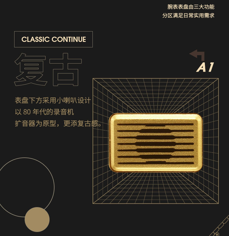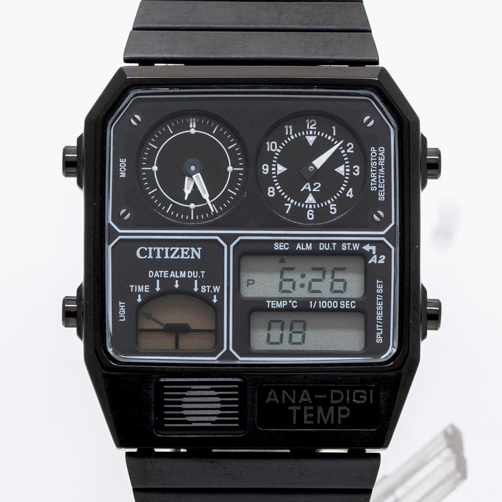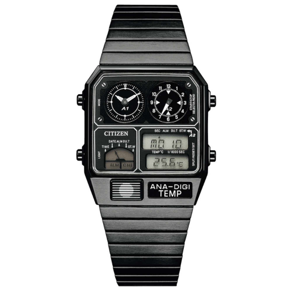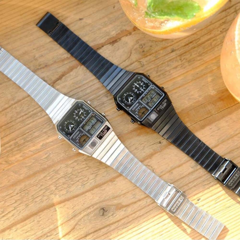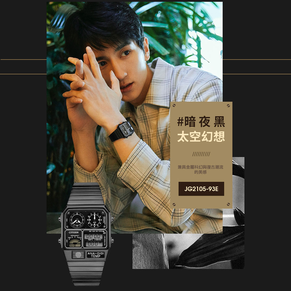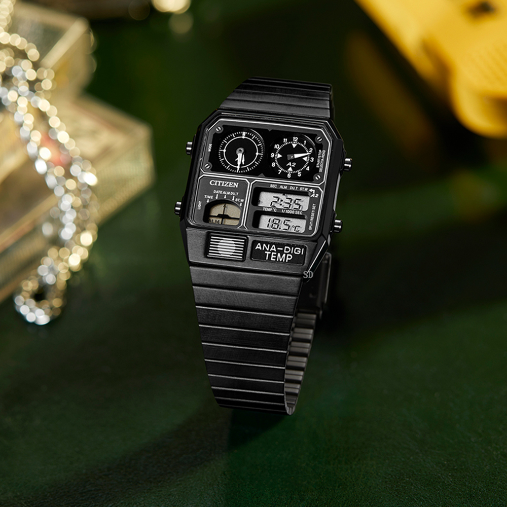 1982年,CITIZEN推出一款兼具指針顯時(ANA)、數位顯時(DIGI)及溫度計測(TEMP)於一體的腕錶,在當時復古未來主義的時代氛圍下大受好評。時至今日,承襲至經典腕錶設計的ANA-DIGI TEMP,維持復刻的方型不鏽鋼錶殼,復古的金屬錶帶設計不僅舒適好配戴更能隨時輕鬆調整錶帶長度。 本次推出全新三款配色:「太空黑」JG2105-93E、「復古金」JG2103-72X 、「時尚銀」JG2101-78E 以過去對未來的想像作為靈感,ANA-DIGI TEMP在錶面上方維持常見的指針顯時之外,下方的數位顯時並行更增添未來感。同樣採用數位顯示的模式選單,快速切換溫度計測、兩地時間顯示、計時碼錶等多樣功能,讓玩賞腕錶之際增添如同操縱宇宙飛船面板的體驗,此外另有實用的電池壽命電源警告功能,當手錶電力即將耗盡時,A2的秒針盤將會以兩秒一跳的方式或數位顯示的時間時與分中間的“:”閃爍提醒佩戴者,輕鬆掌握腕錶電量。這款腕錶不僅具備實用功能,更創造出80年代復古未來主義與新潮腕錶結合的絕佳風格。