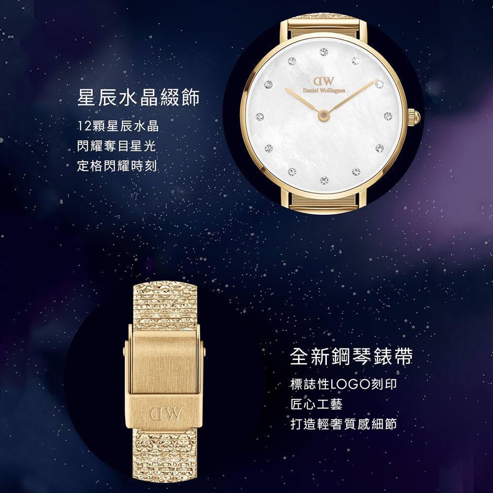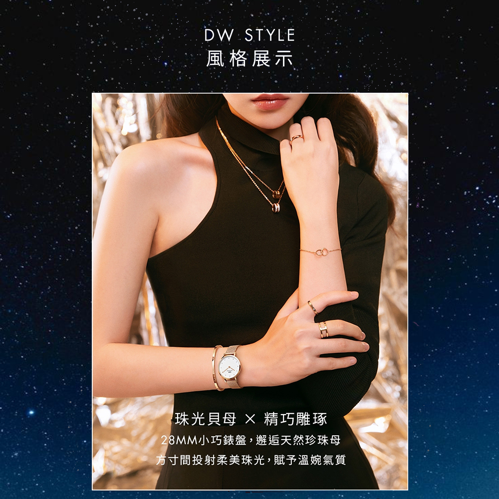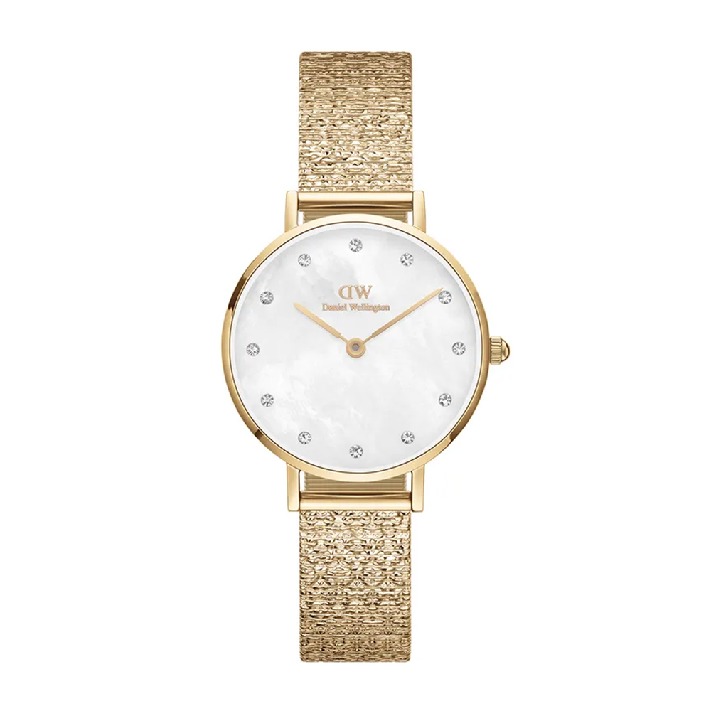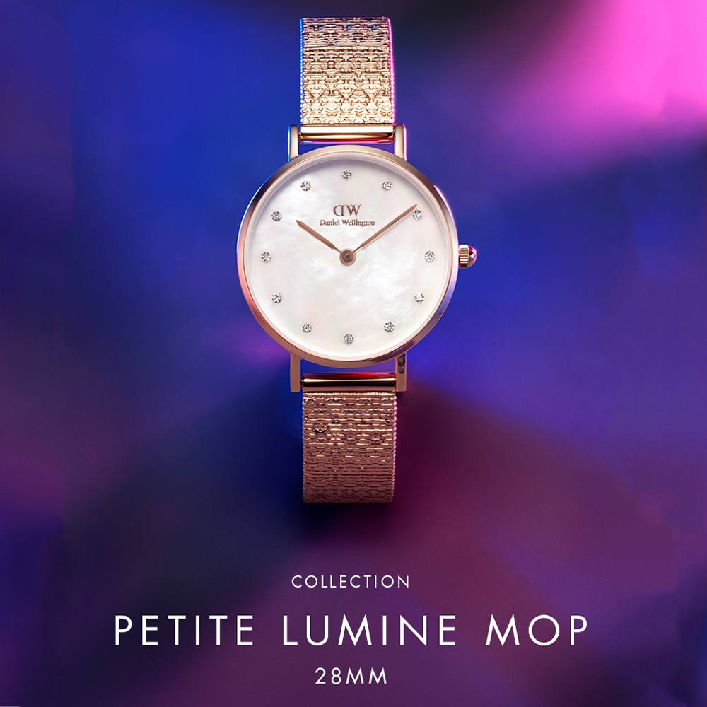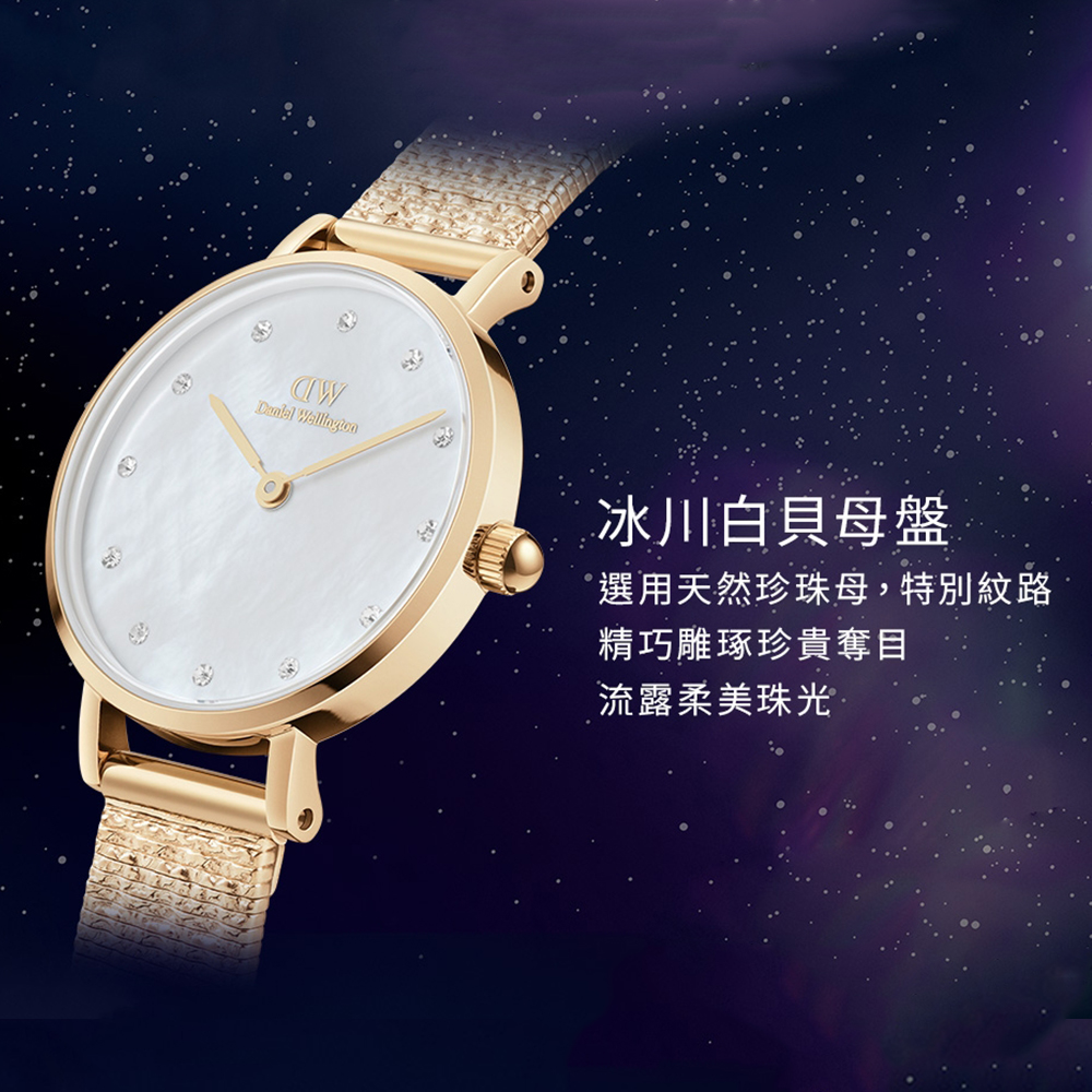 DANIEL WELLINGTON Petite 白色珍珠母貝腕錶,見證自然之美也可以醞釀出極致奢華。每個錶盤都採用珍珠母貝精製而成,紋路獨一無二。以水鑽精鑲的刻度,讓錶面由內而外散發柔美的光澤。腕錶搭配我們最新的 Studio 壓紋金屬錶帶,其有如流雲般的閃動光澤與珍珠母貝的紋路相互輝映。