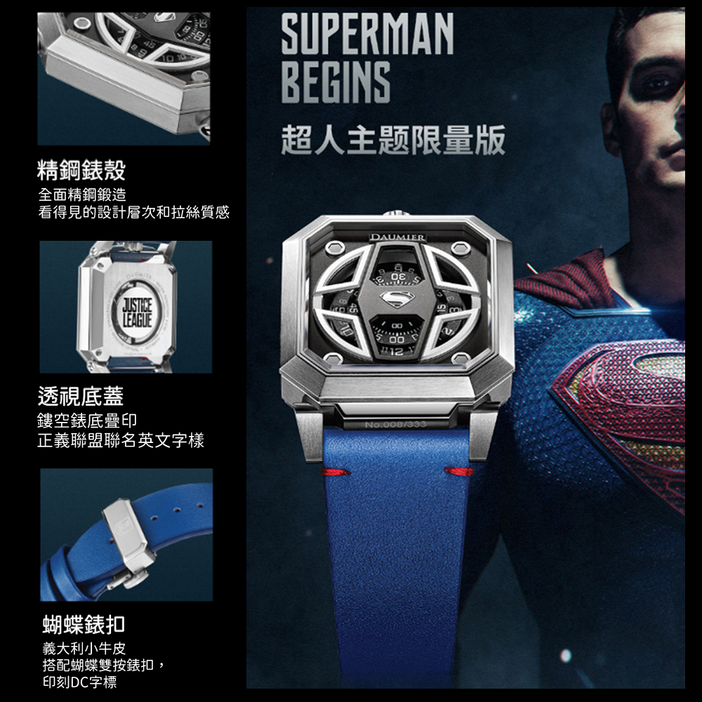 全球333件 原廠公司貨 立體三維顯時錶盤 超人專屬色系造型 配備藍寶石水晶鏡面 正義聯盟標誌透明背蓋 料號: DM-JLW016.SGSN.2SNN.S.M DAUMIER X JUSTICE LEAGUE合作設計 JUSTICE LEAGUE限量版腕錶系列 具有趣味性和獨特的超級英雄風格 DAUMIER JUSTICE LEAGUE腕錶系列由歐洲設計師團隊設計 在《正義聯盟》中採用6個超級英雄: 蝙蝠俠,超人,神力女超人,水行俠,閃電俠和鋼骨 瑞士手錶品牌DAUMIER集結了整個團隊的精英和專家 包括自動機芯專家,三維繪圖團隊,鐘錶工程師,設計團隊等 以《正義聯盟》為主題,為每位英雄打造專屬腕錶 DEVIA系列設計靈感來自JUSTICE LEAGUE超級英雄的頭盔和盔甲設計 立體三維錶盤,新的時、分和秒刻度盤設計,是該系列的突出特點 錶款設計展現了歐洲簡約的設計風格,使人變身成現實生活中的超級英雄