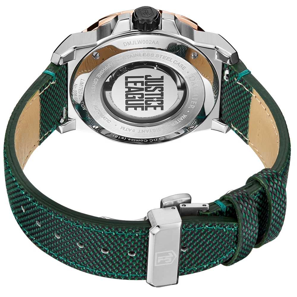 全球666PCS 原廠公司貨 具日期顯示 六點鐘方向偏心陀飛輪設計 水行俠專屬色系造型 配備藍寶石水晶鏡面 正義聯盟標誌透明背蓋 料號:DM002T.RTN.5RNI.S.L DAUMIER X JUSTICE LEAGUE合作設計 JUSTICE LEAGUE限量版腕錶系列 具有趣味性和獨特的超級英雄風格 DAUMIER JUSTICE LEAGUE腕錶系列由歐洲設計師團隊設計 在《正義聯盟》中採用6個超級英雄: 蝙蝠俠,超人,神力女超人,水行俠,閃電俠和鋼骨 瑞士手錶品牌DAUMIER集結了整個團隊的精英和專家 包括自動機芯專家,三維繪圖團隊,鐘錶工程師,設計團隊等 以《正義聯盟》為主題,為每位英雄打造專屬腕錶 MUTATE系列設計靈感來自超級英雄的武器和戰鬥裝備 例如錶圈,錶冠護罩,皮帶等,是該系列的突出特點 錶款設計充分體現了超級英雄的個性,使人變身成現實生活中的超級英雄