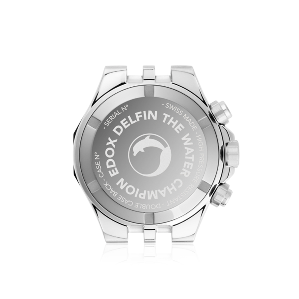 Delfin 水上冠軍系列,十二邊形錶圈 底蓋上鐫刻水上冠軍的標誌 防水200米,夜光指針刻度 享譽盛名的瑞士製錶廠 EDOX 1961 年首度發表了 Delfin 表款 特殊設計的強化雙層防水後蓋,並擁有專利的雙膠圈表冠系統和 堅固的防撞擊能力Delfin防水可達200米,是許多 EDOX 表款的前身 特別適合於海上的活動,例如帆船、潛水和動力快艇。 瑞士依度表以超過 50 年的防水錶專業領域經驗重新演繹 Delfin計時馬表 經典的復古表殼造型保留原創精神 - 特有 70 年代不鏽鋼的錶殼 十二邊形錶圈設計。採用 EDOX 10 Ronda 5021.D 機芯 擁有堅固的強化後底蓋,錶底蓋上鐫刻水上冠軍的標誌, 沿襲之前的驕傲即使在深海高壓的環境中也能順利運行。