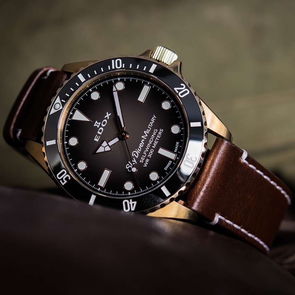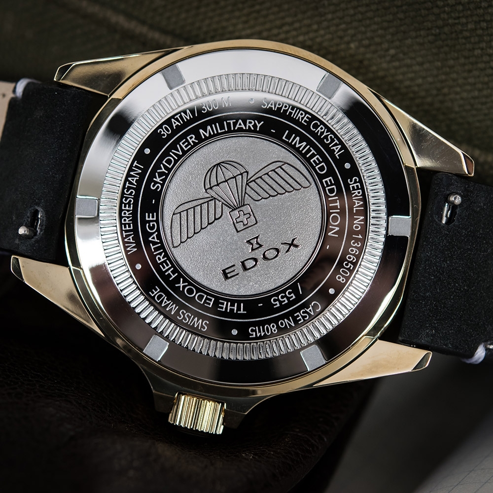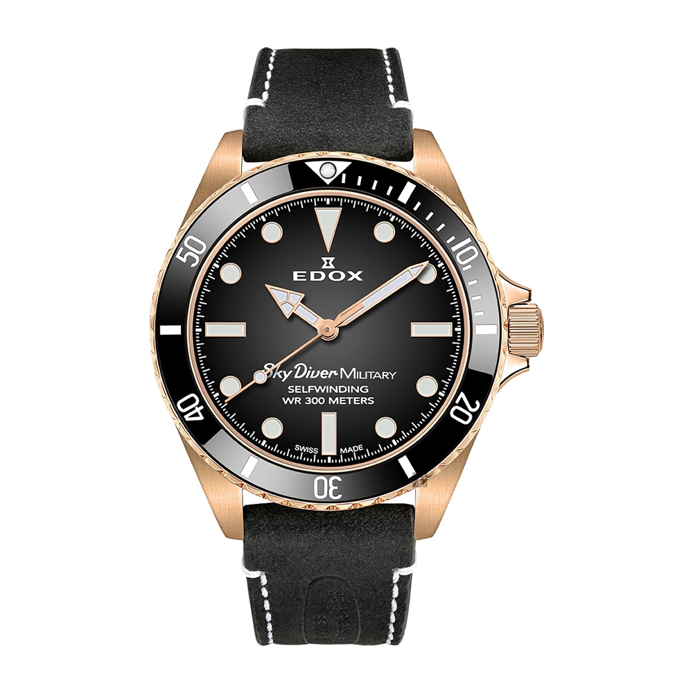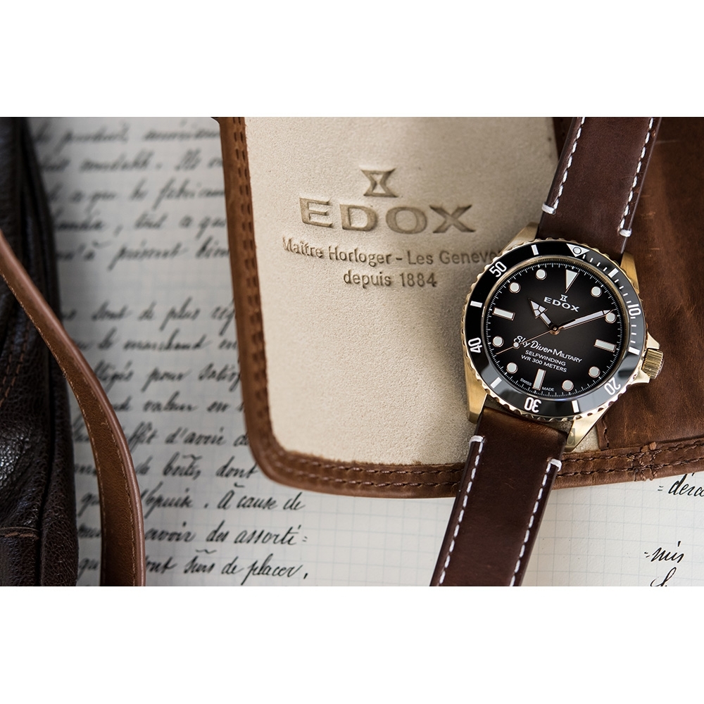 ▶全球限量555套,SkyDiver 傘兵悍將青銅錶 ▶瑞士自動上鍊機芯,錶底蓋降落傘圖案與限量編號 ▶快拆式黑色皮帶,附贈棕色皮帶與攜帶式收藏錶皮套 The SkyDiver Military 傘兵悍將 向傘兵及其在陸地,空中或海上可能面臨的極端條件致敬 並向EDOX 135年的歷史及傑出的'軍錶愛好者致意 SkyDiver 300米防水,採用自動三針瑞士機芯,搭配潛水錶陶瓷圈和錶底蓋降落傘圖案 以令人驚嘆的青銅錶殼呈現,這種合金強烈凸顯與軍方的緊密聯結也將EDOX防水特性表現無遺 隨著時間消逝銅殼保護塗層將漸層式的呈現獨特的青銅光澤,增添復古軍錶的韻味 青銅在漸層黑錶盤與黑色皮革搭襯下更加唯美,特殊的皮革袋中配有棕色皮帶及快拆的裝備 藍寶石水晶錶鏡 和Superluminova X1夜光指針和刻度將確保在極端條件下的耐刮和可讀性。 Edox瑞士依度表,作為瑞士少數家族企業之一,自豪自身的傳統同時融入創新和想像力 以其高度防水的腕錶,複雜的手工拋光錶殼,和傳統的手工組裝而聞名。