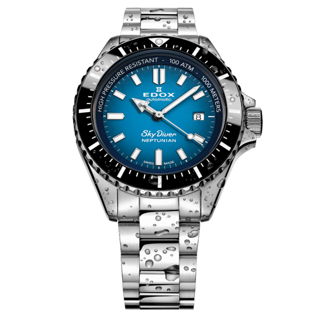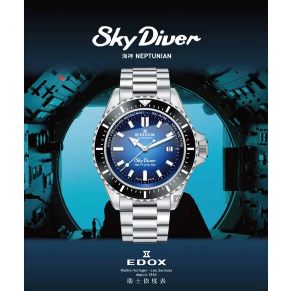 ▶Skydiver Neptunian-海神波賽頓 ▶1000米防水,備有深海排氦氣閥 ▶陶瓷錶圈和錶殼底蓋刻有海神波賽頓雕刻圖騰 深海1000米防水機能,旋入式錶冠設計 搭載藍寶石水晶鏡面及陶瓷錶圈 錶殼底蓋刻有獨特的海神波賽頓雕刻圖騰 3點鐘方向日期'視窗,經典時、分、秒大三針顯示 SuperLuminova X1 軍用夜光塗層指針 可以在弱光下或在水下閱讀時間 Automatic Calibre 80機芯具有42小時動力儲備 即使在海洋深處也不會錯過任何時間與節奏。 傳奇的SkyDiver 強悍運動系列專門為傘兵精銳部隊而設計 SkyDiver Neptunian 是永恆經典的自然演變 保持其1973年歷史遺跡經典同時也融入現代腕表風格 也是Edox Water Champions 另一個驚嘆腕表系列的誕生。