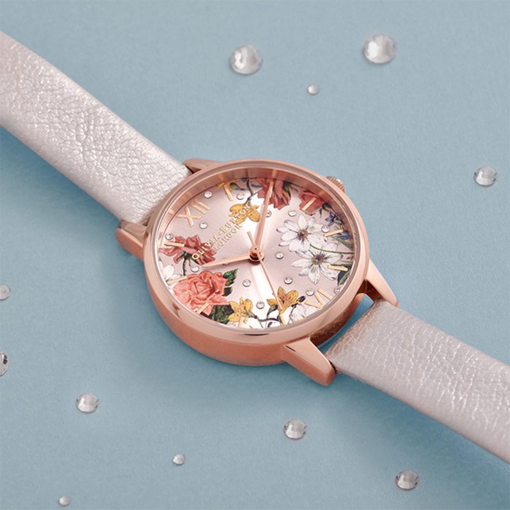Olivia Burton 再次美出新高度!秋季推出的 Sparkle Florals 系列仙氣十足,優雅的手繪繁花綻放在閃亮錶面上,搭配夢幻水晶鑽飾勾勒出夢幻英倫花境,在手腕間譜出了璀璨的浪漫詩意 ! 為女孩們的秋日時尚搭配增添更多優雅細節。