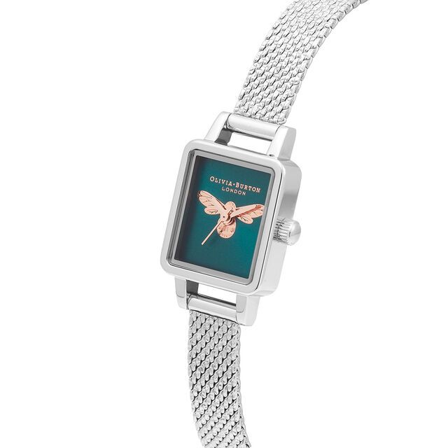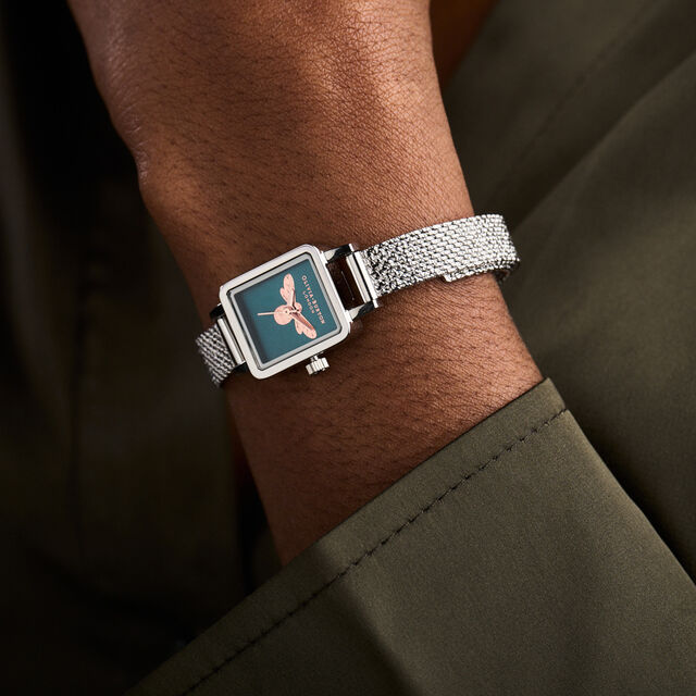 這款腕錶時尚奢華,經典款型與最重要的現代風格相得益彰。迷你矩形錶盤採用藍綠色太陽紋飾面,可在您移動時捕捉光線。它飾有玫瑰金蜜蜂圖案和混合金屬細節,是搭配銀色和玫瑰金手鍊的完美單品。