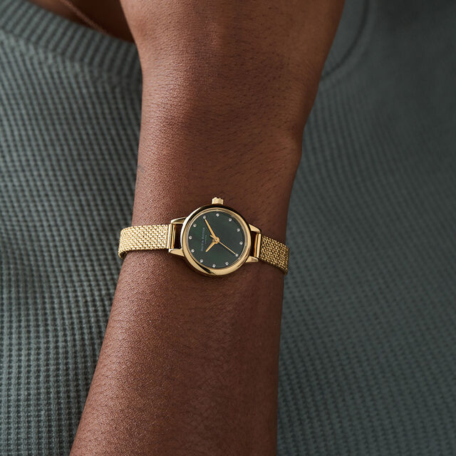 輕鬆優雅,從舊好萊塢魅力的頹廢中汲取靈感。翠綠色錶盤由珍珠母製成,營造出無窮無盡的色彩深度,意味著沒有兩塊手錶是一樣的。這件單品飾有奢華的水晶標記和鍍金,是永恆的。