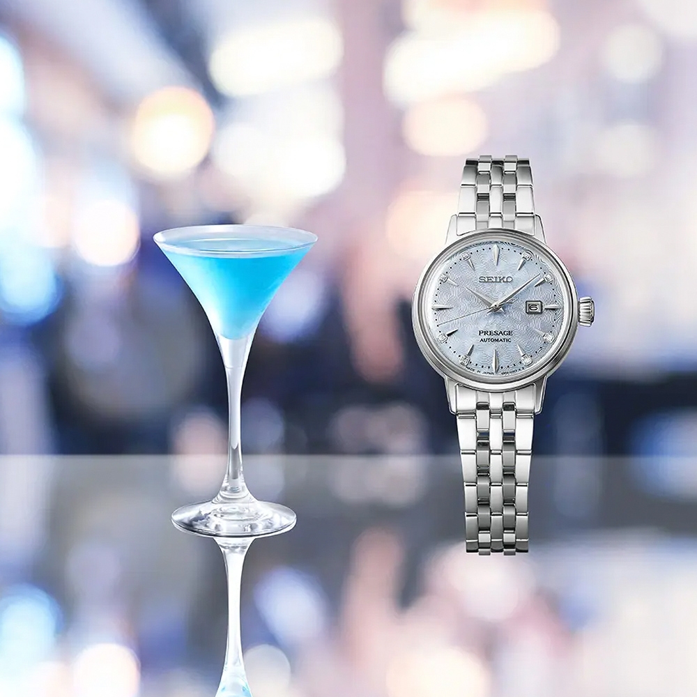 Presage調酒系列新推出女錶,美麗的面盤另人聯想柔和的調酒,8顆美鑽點綴在面盤上,再加上復古感的箱型玻璃鏡面,展現出優雅的氛圍。 【面盤】 面盤進行多道的透明塗層,然後再去研磨平整,創造出耀眼的視覺效果。時標上的8顆美鑽增添輕奢華感。 【錶殼】 保留調酒系列的經典設計,例如箱型玻璃、劍形時標、時針與分針,另外新款錶殼尺寸縮小至 30 mm,更適合女性配戴。 【錶帶】 即使在光線昏暗的酒吧裡,鏡面拋光的五排金屬鍊帶仍可在手腕上閃閃發光,不會被忽視。 錶帶具有優雅而實用的錶扣,易於配戴,優雅的設計也適合於正式場合中帶上它。 SRE007J1的設計靈感來自Sky Diving調酒。