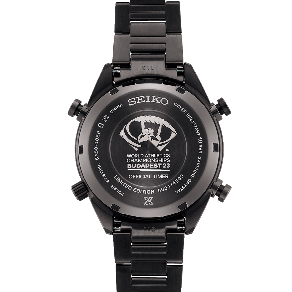 Prospex推出外觀更具設計感的四款全新的太陽能計時碼錶,並搭載全新的8A50太陽能計時機芯, 擁有能夠以1/100秒為單位進行計測的精密碼錶功能。 為了確實讀取計測時間,新款最大的特徵在於四個計時顯示完全獨立的面盤配置, 在2點鐘位置設有1/100秒計時子盤、12點鐘位置設有秒盤、10點鐘位置設有1/10秒計時盤。 自從1985年以來,國際業餘田徑總會(現為世界田徑總會)主辦的田徑運動殿堂「世界田徑錦標賽」皆是由SEIKO擔任大會的官方計時, 而今年夏天於匈牙利布達佩斯舉辦的2023年世界田徑錦標賽也是SEIKO連續18屆負責賽事的計時工作,展現品牌不斷對於計時精準的重視。 而為慶祝此一盛事,SEIKO推出2023紀念限量款,錶款面盤部分採用了帶有田徑場跑道質感的壓製紋路, 指針與各個小錶盤的外圈則使用了象徵榮耀的金色, 藉由這只紀念限量款讓配戴者也能感受到體育館中一場又一場熱血賽事的狂熱。