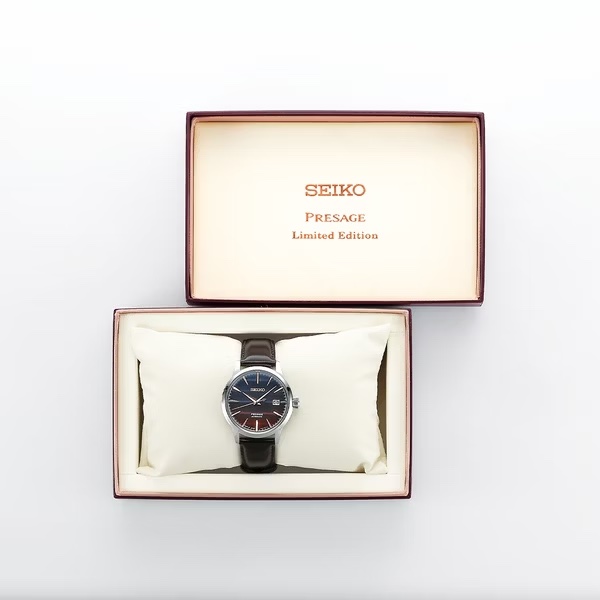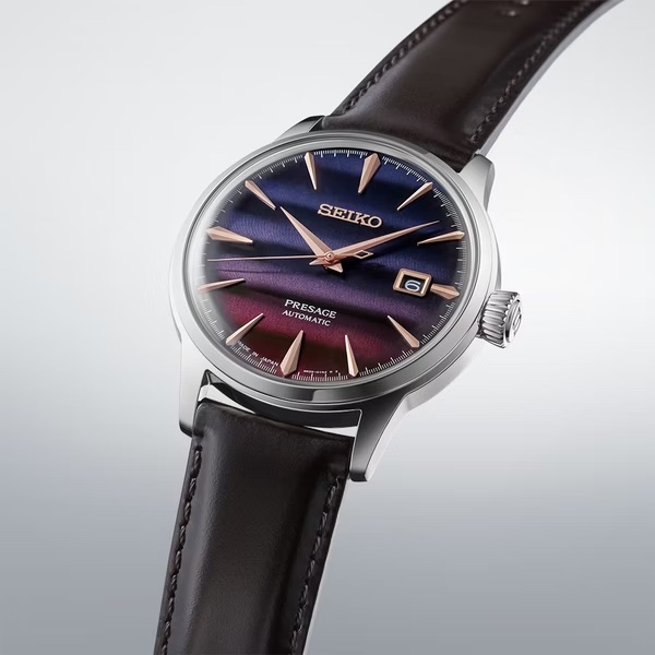 【以東京美麗的夕陽為靈感,Presage調酒系列推出與銀座STAR BAR合作的限定錶款】 靈感來自東京日落時天際,隨著時間的推移而呈現不同的表情。 以漸層設計表現天空顏色的變化,飄逸在天空中的雲朵以波浪狀紋路呈現, 將東京黃昏的景色刻劃在面盤中。 SRPK75J1面盤的設計靈感來自於 STAR BAR 創作的原創雞尾酒 Purple Sunset。 從海軍藍到紫色的漸層變化表現了日落時逐漸變暗的天空,同時保留了夕陽的微紅色調。