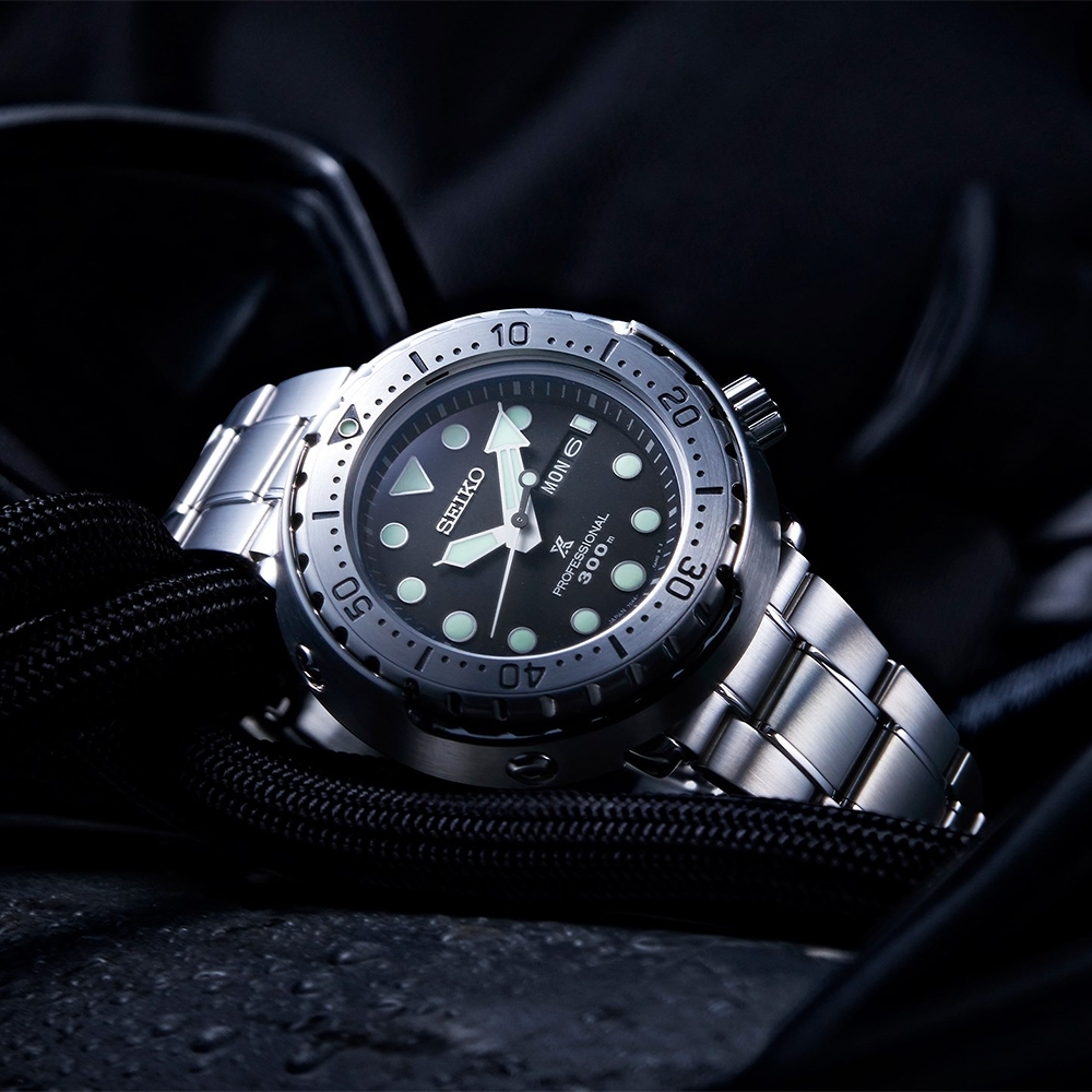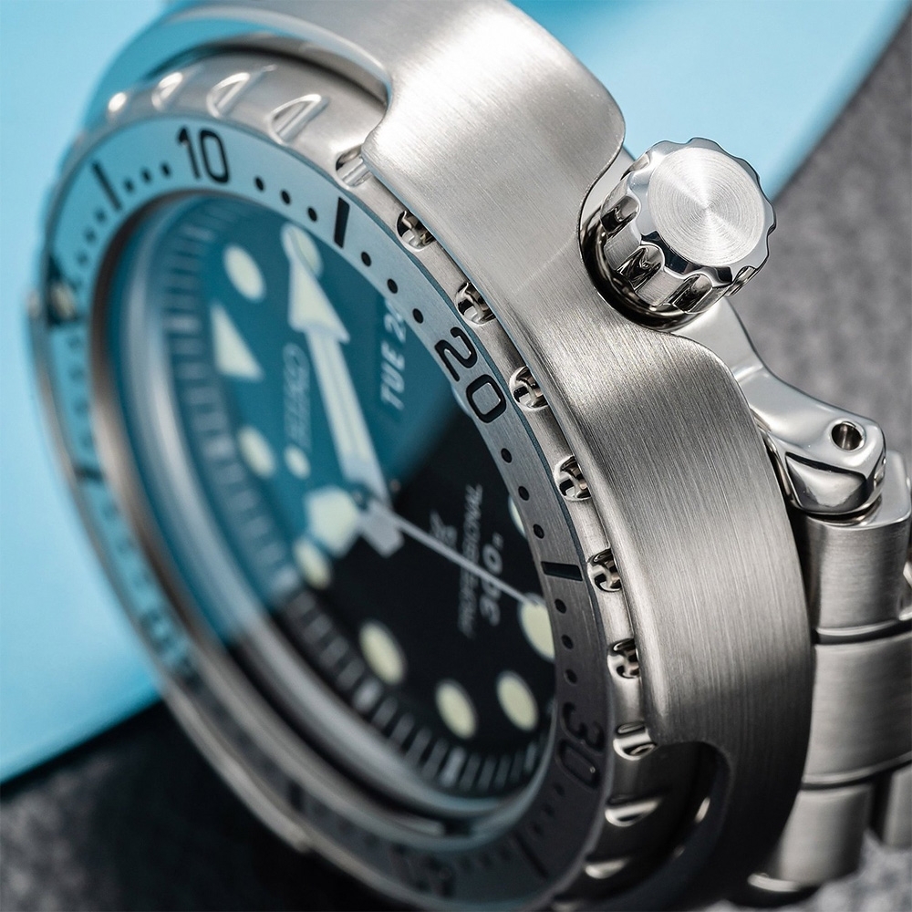 EIKO旗下PROSPEX Marinemaster全新專業運動潛水錶注定躋身雋永經典, SEIKO PROSPEX潛水錶歷久彌新 經典潛水錶新作問世 震撼BASELWORLD巴塞爾錶展 PROSPEX潛水錶的防撞擊包覆式錶殼為其一大造型特色,乍看像鮪魚罐頭一般, 因此也被錶迷暱稱為「鮪魚罐頭」,這外型自1975年問世後至今不變,轉眼叱吒錶壇數十載,已是日系潛水錶的經典代表作。