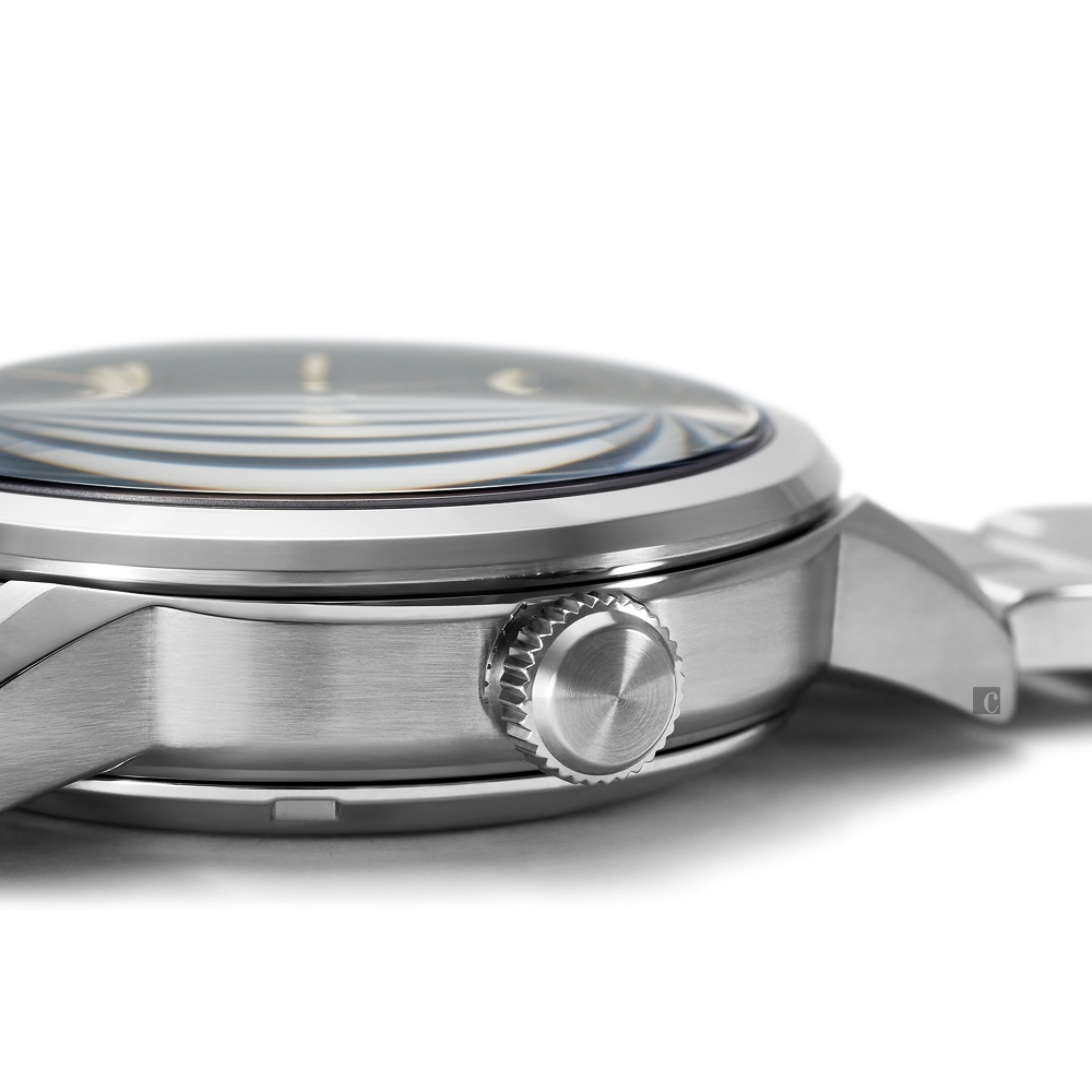 【經典的1959 年 Alpinist 腕錶現代詮釋版】 三根指針與刻度都在銀色底座施以環保蓄光塗料,營造出多層次視覺效果。 錶殼經過研磨拋光處理後,與錶盤、錶殼的流暢圓弧輪廓結合,顯得格外現代感。