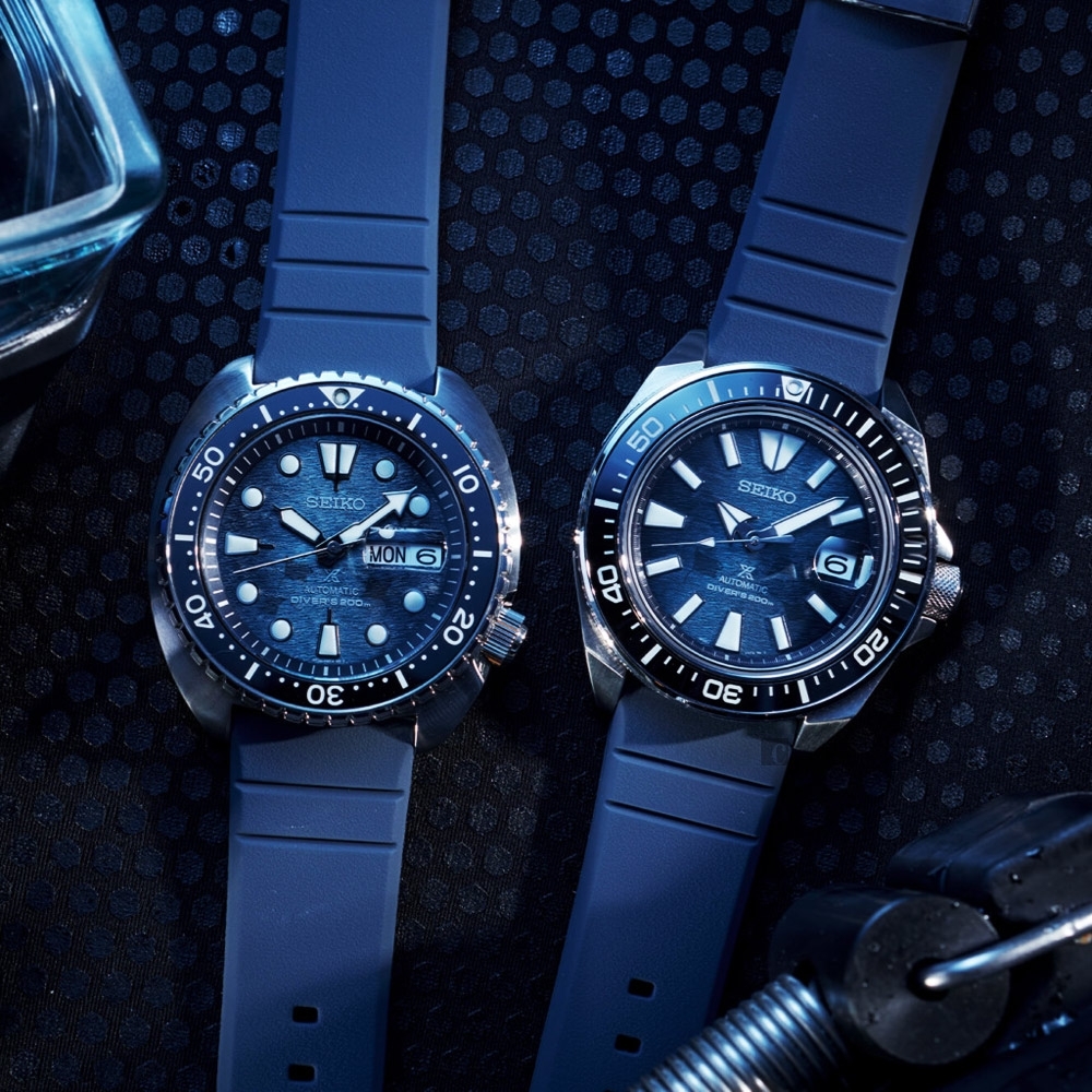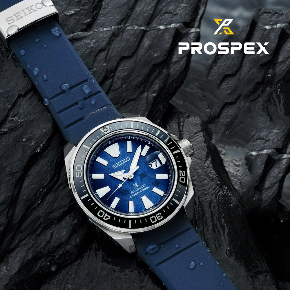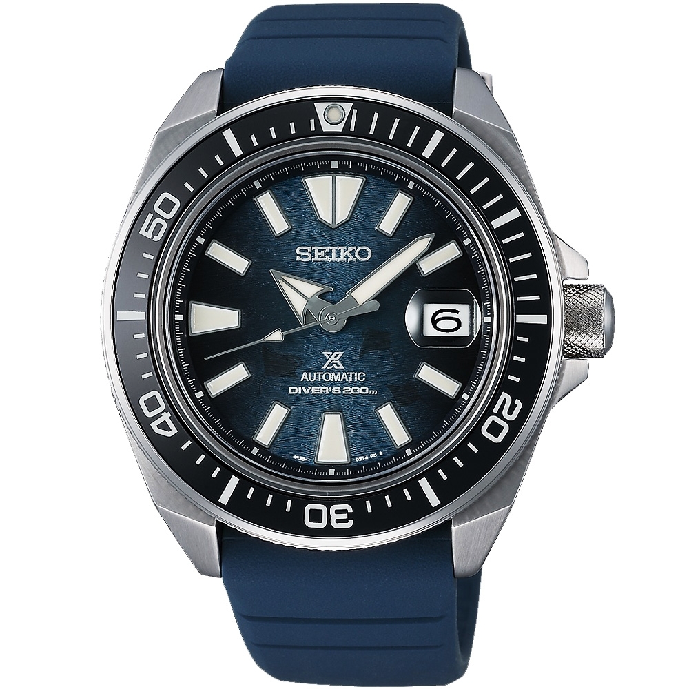 愛海洋 武士王,專業200米潛水腕錶 由精工武士暢銷型號所改進,保留經典外觀, 引入以蝠鱝為靈感的灰藍錶盤,以及新的矽膠錶帶 承襲 Seiko 的潛水腕錶專業經驗,更將潛水腕錶的工藝推向技術極致 自動上鍊(手上鍊),動力儲存41小時,寶石數24石,日差+45~-35秒 不鏽鋼錶殼、親膚矽膠錶帶、藍寶石水晶鏡面 、單向旋轉陶瓷錶圈、 可鎖式錶冠、旋入式背蓋、日期星期顯示。