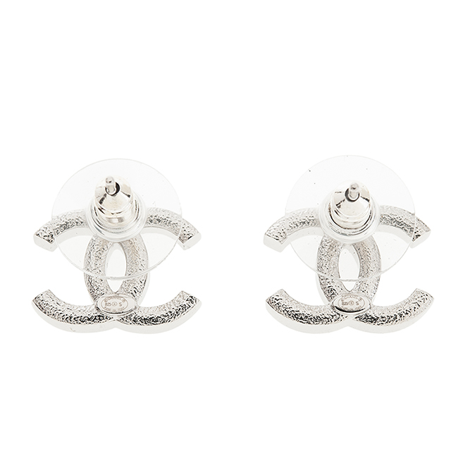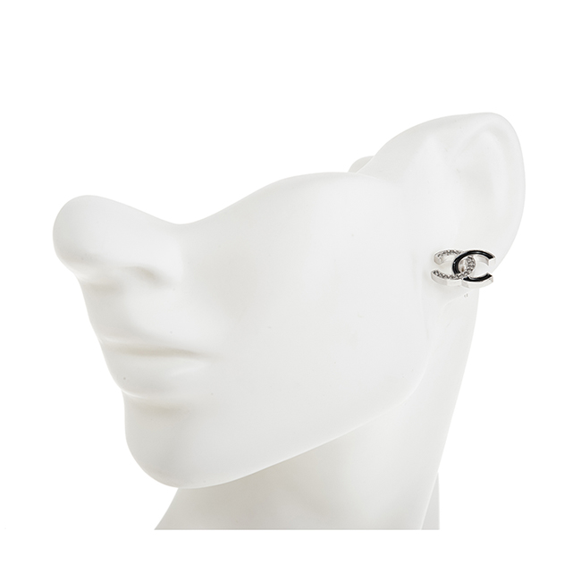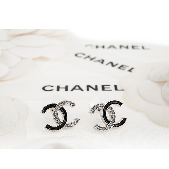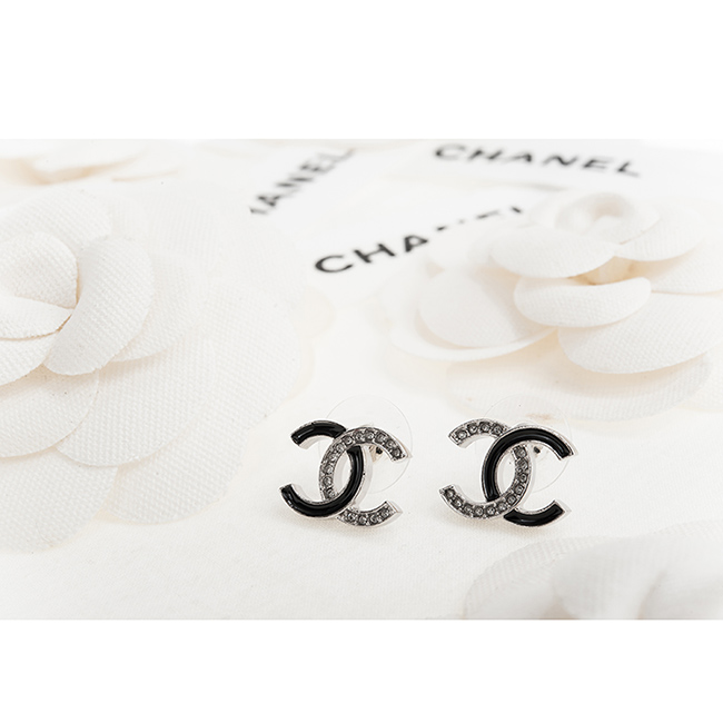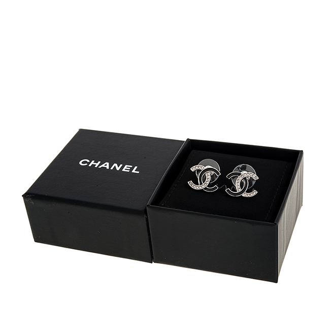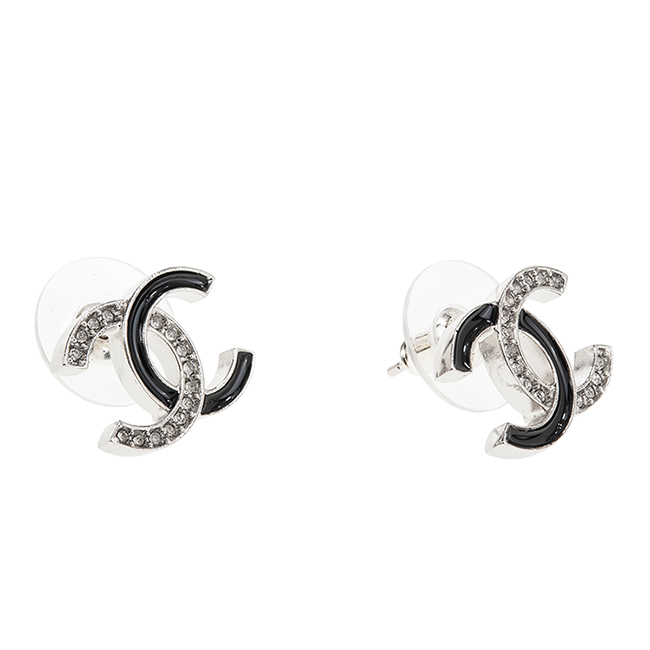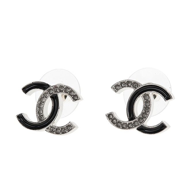 CHANEL 新款雙色雙C LOGO水鑽琺瑯穿式耳環 (黑/銀)