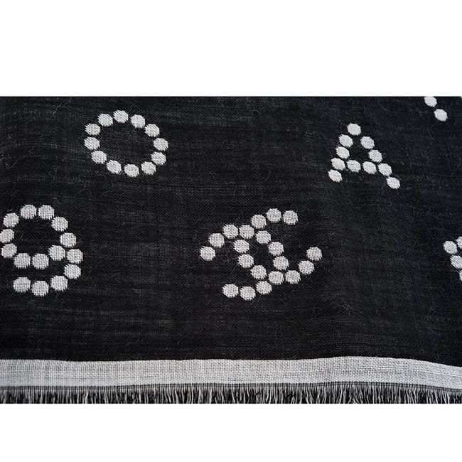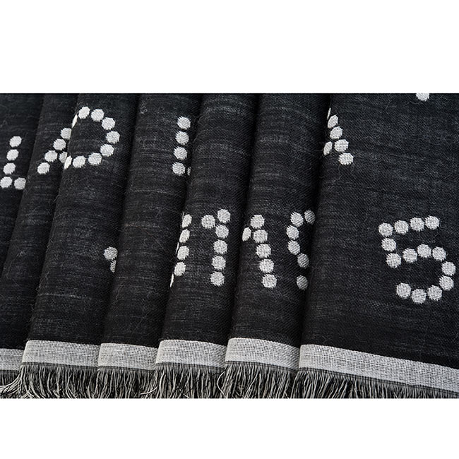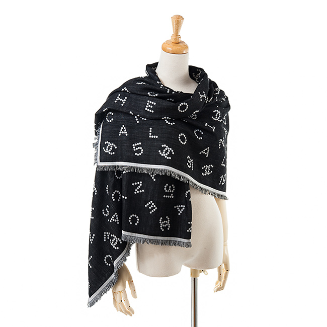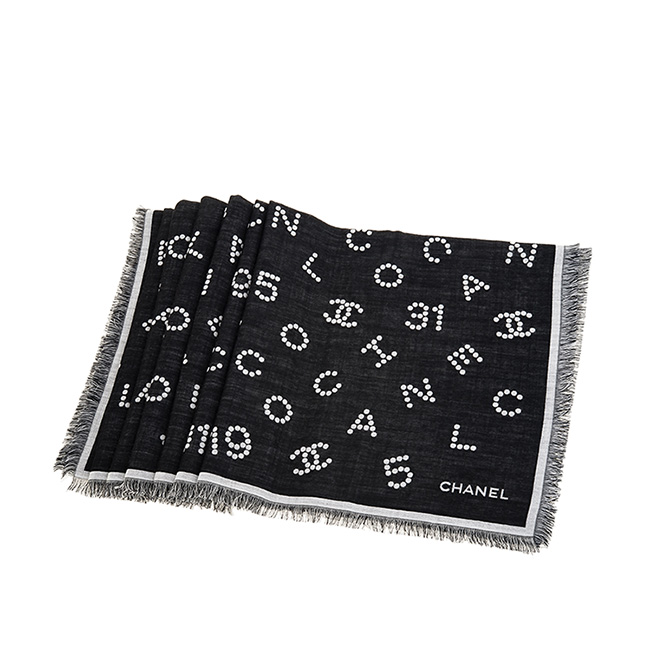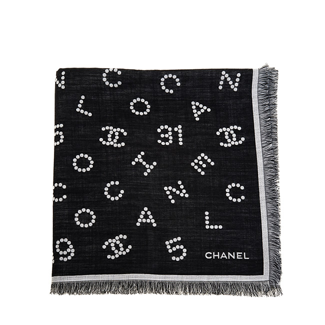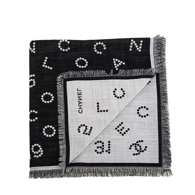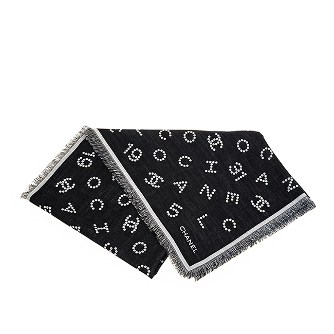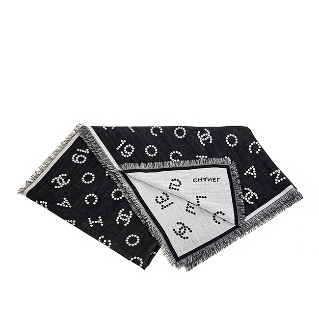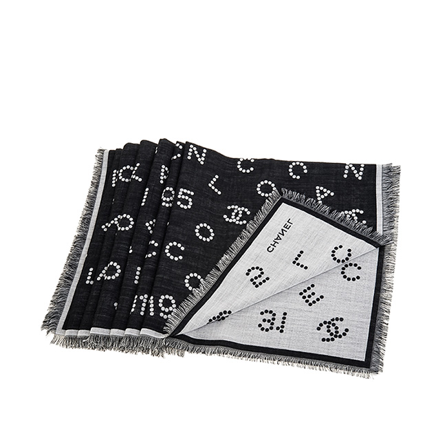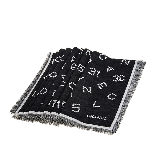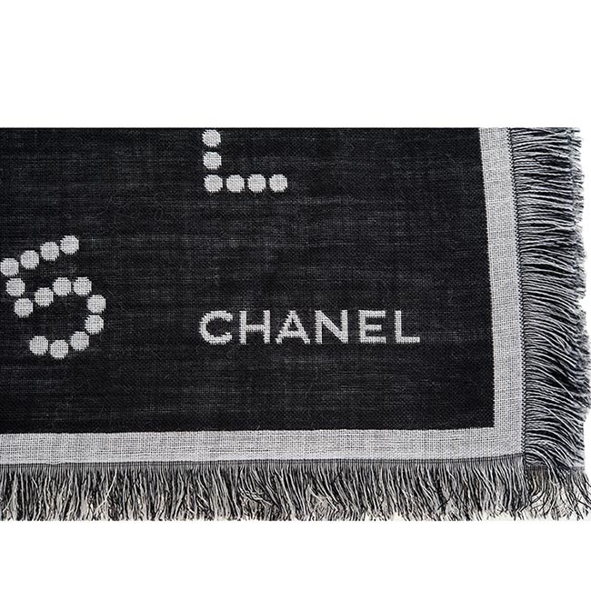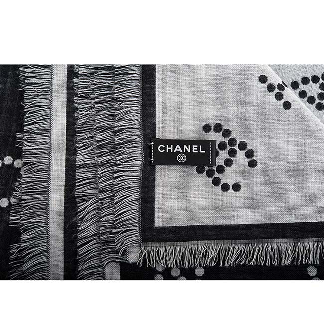 CHANEL 香奈兒 新款黑白色圓點字母CC線條滾邊羊毛混真絲流蘇披肩 (黑色)