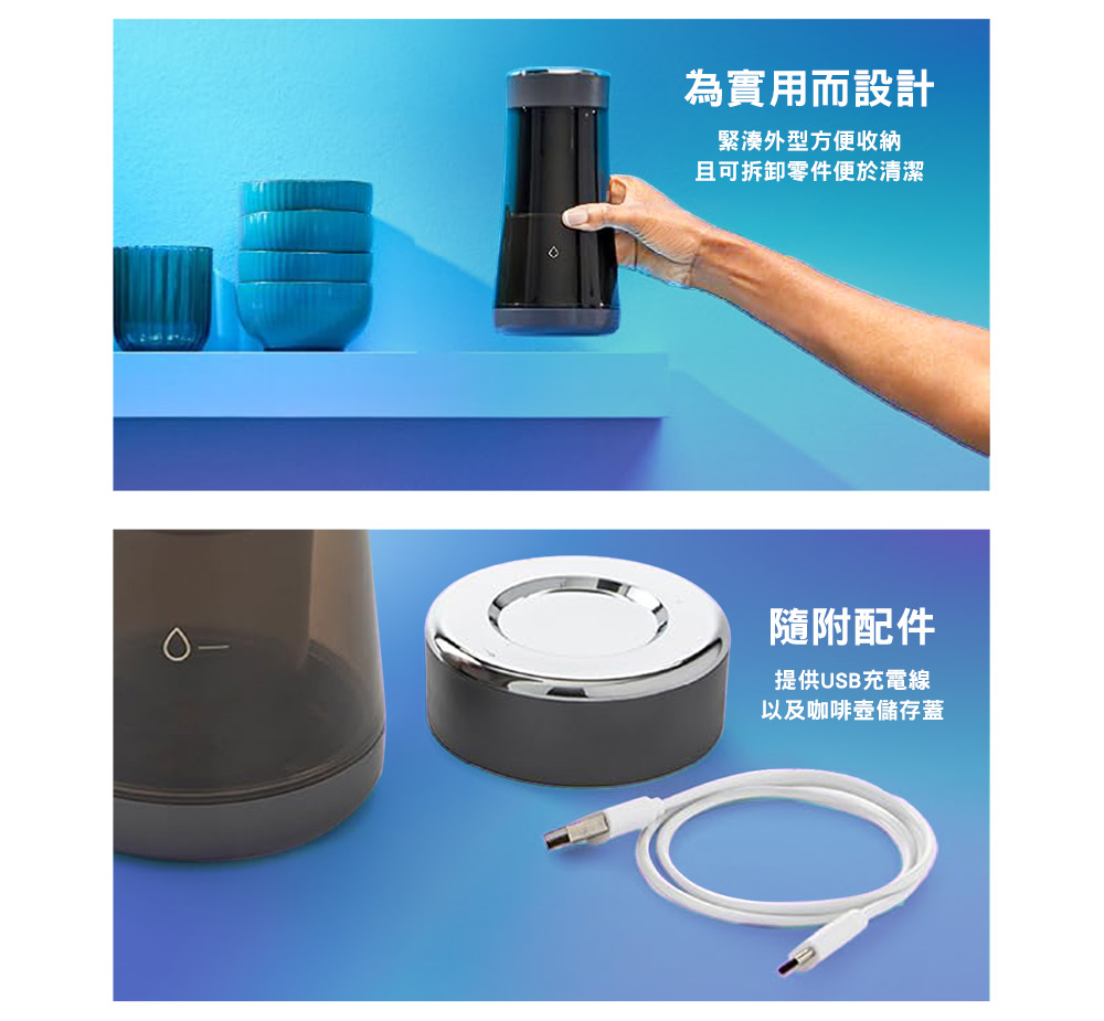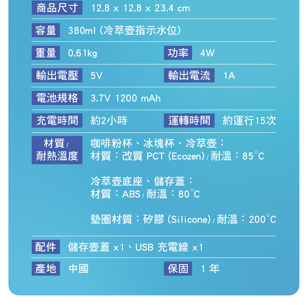 咖啡粉杯, 冰塊杯, 冷萃壺 材質:改質 PCT (Ecozen)/ 耐溫:85度C/冷萃壺底座, 儲存蓋 材質:ABS/ 耐溫:80度C/墊圈材質 材質:矽膠 (Silicone)/ 耐温:200度C