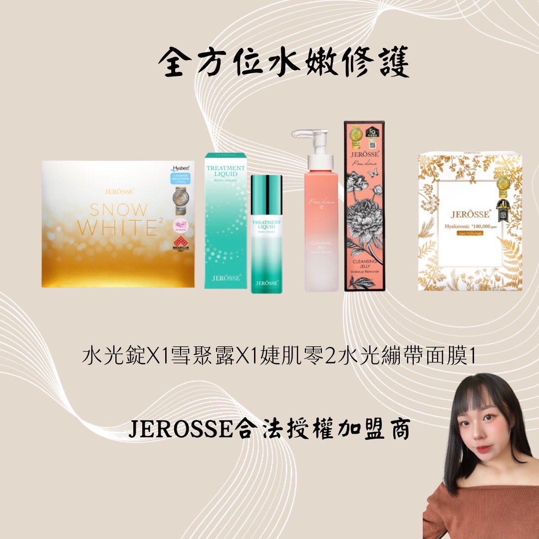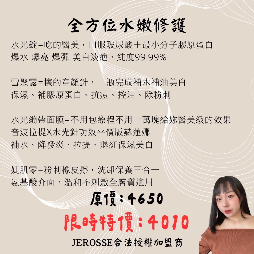 全方位水嫩修護 水光錠=吃的醫美,口服玻尿酸+最小分子膠原蛋白 爆水爆亮爆彈美白淡疤,純度99.99% 雪聚露=擦的童顏針,一瓶完成補水補油美白 保濕、補膠原蛋白、抗痘、控油、除粉刺 水光繃帶面膜=不用包療程不用上萬塊給妳醫美級的效果 音波拉提X水光針功效平價版赫蓮娜 補水、降發炎、拉提、退紅保濕美白 婕肌零=粉刺橡皮擦,洗卸保養三合一 氨基酸介面,溫和不刺激全膚質適用 原價:4650 限時特價:4010 JEROSSE合法授權加盟商