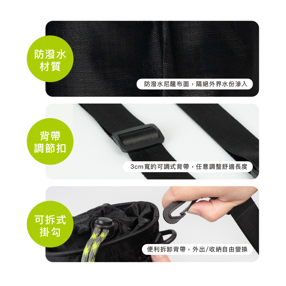 包裝內容物:圓筒收納袋x1、可拆式背帶x1
