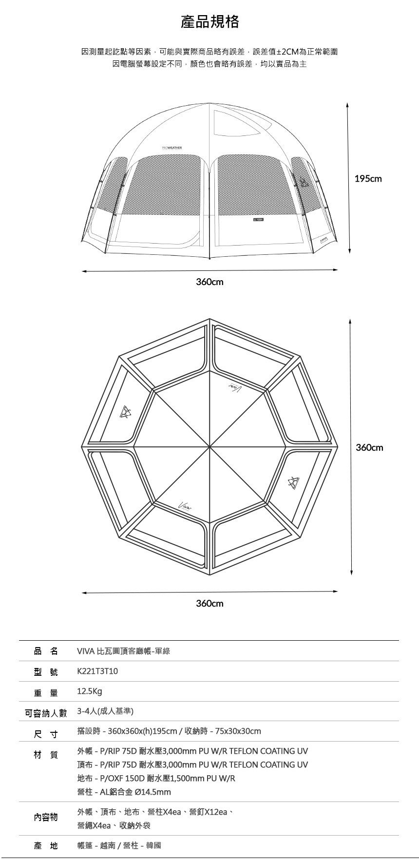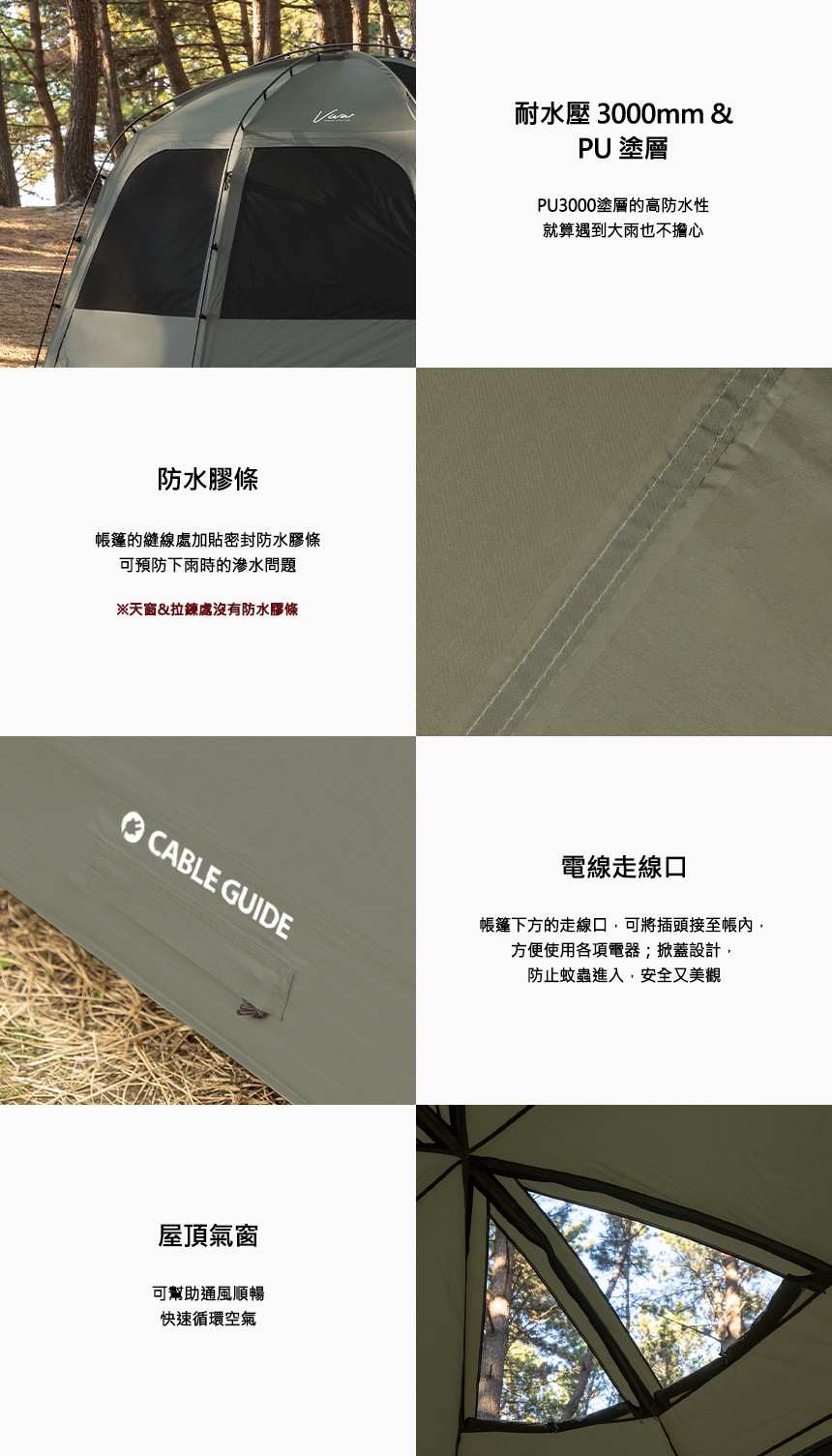可自由活動 寬敞的室內空間 僅4支營柱即可簡單安裝 採用高級塗層 有效防髒汙 全開放 8面紗網 擁有開過視野 透氣又防蚊蟲 地布可自由拆卸 頂部天窗設計