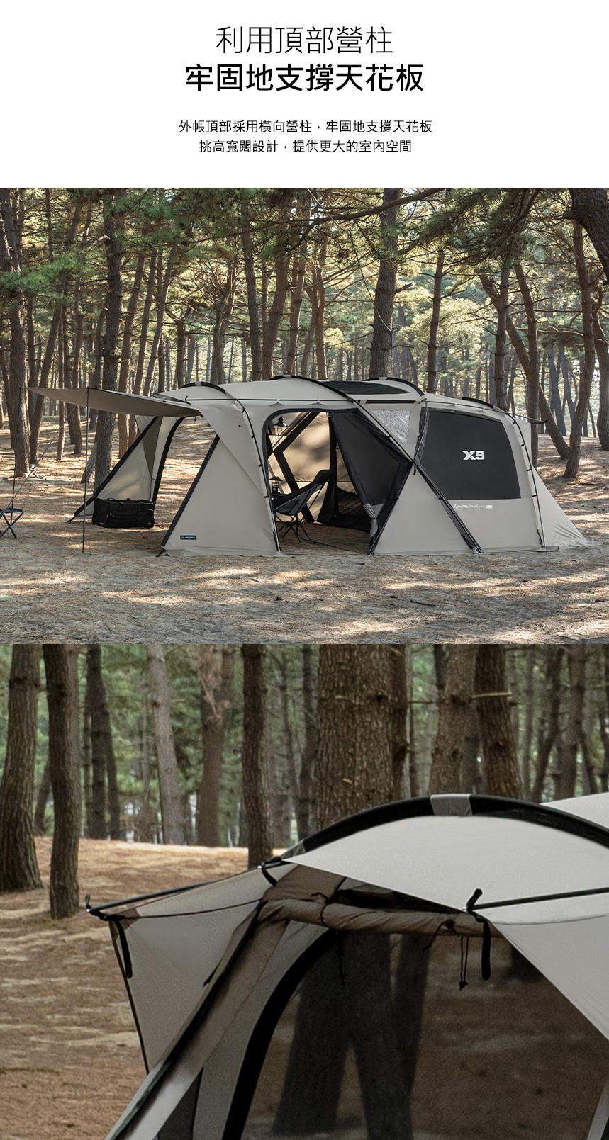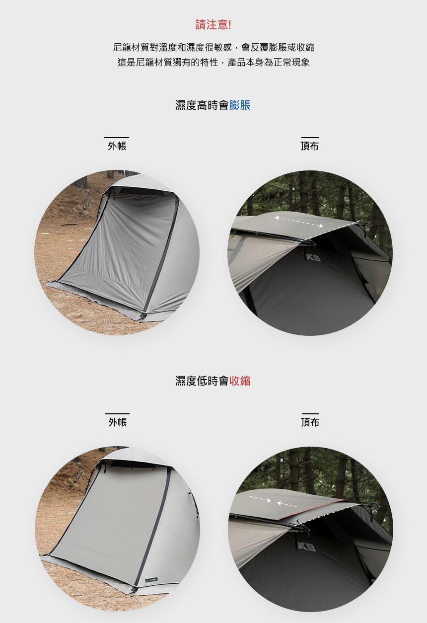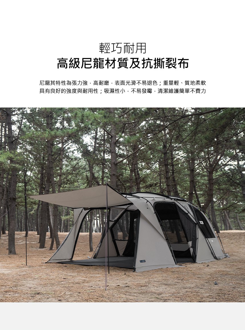 內容物:外帳、內帳、頂布、地布、主營柱*2ea、前/後營柱*2ea、頂部營柱*3ea、前庭營柱*2ea、營釘*18ea、營繩*6ea、收納袋