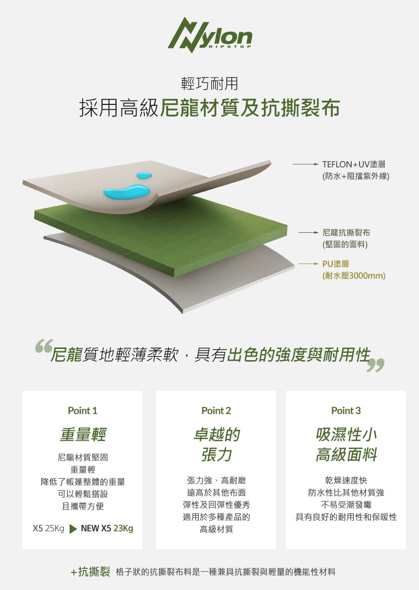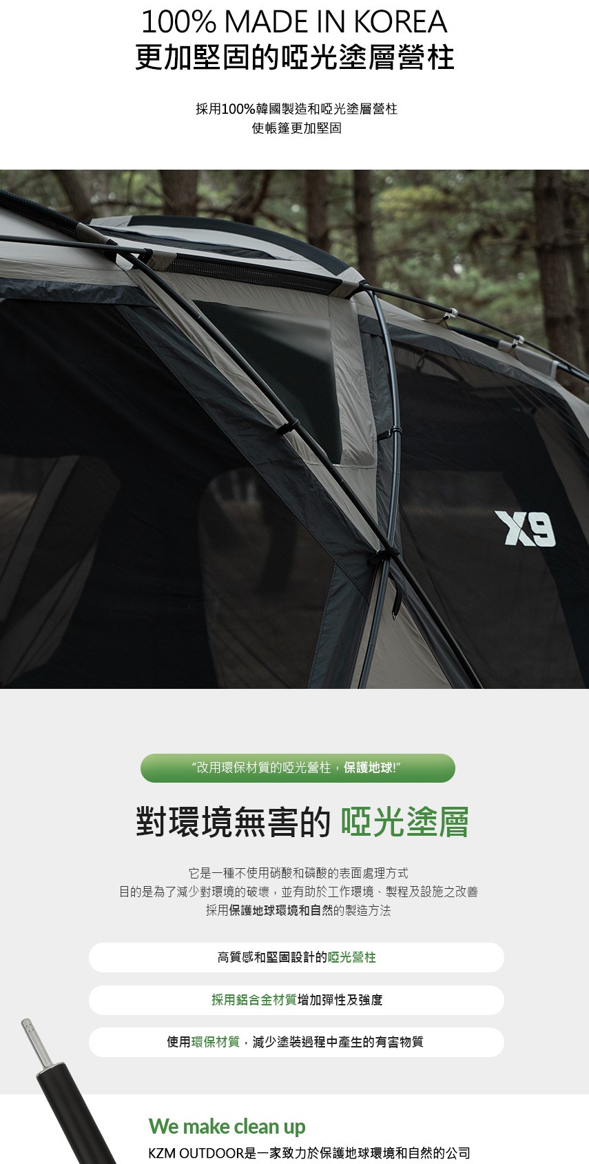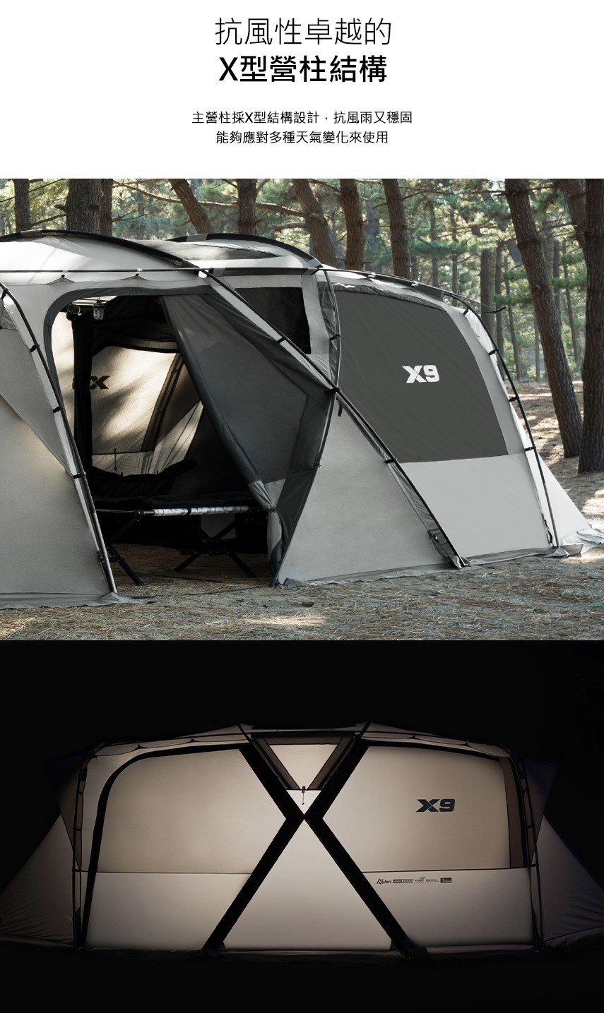 內容物:外帳、內帳、頂布、地布、主營柱*2ea、前/後營柱*2ea、頂部營柱*3ea、前庭營柱*2ea、營釘*18ea、營繩*6ea、收納袋