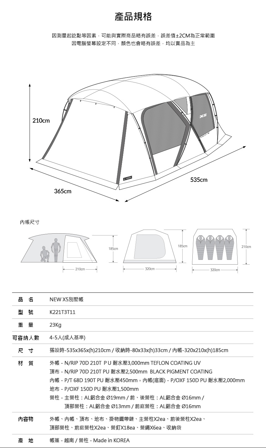 尺寸:搭設時-535x365x(h)210cm/收納時-80x33x(h)33cm/內帳-320x210x(h)185cm