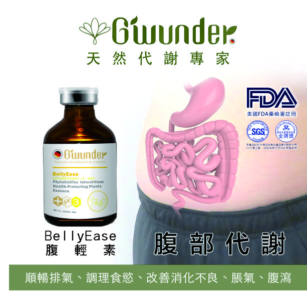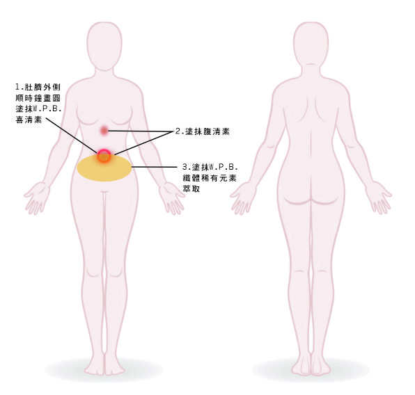 【腹輕素】植物幹細胞間質保健精萃 適用族群:胃腸功能低下、食慾旺盛、排便不順暢、腰圍過大 配方作用: 1.暖胃、促進消化功能 2.改善消化不良、脹氣問題 3.促進腸道健康 使用建議: 1.順時鐘塗抹W.P.B.喜清素一~二圈於肚臍外側一指寬處。 2.塗抹【腹輕素】於肚臍外側一指寬處,順時鐘塗抹開。 3.使用W.P.B纖體稀有元素塗抹腹部。 容. 量:20ml