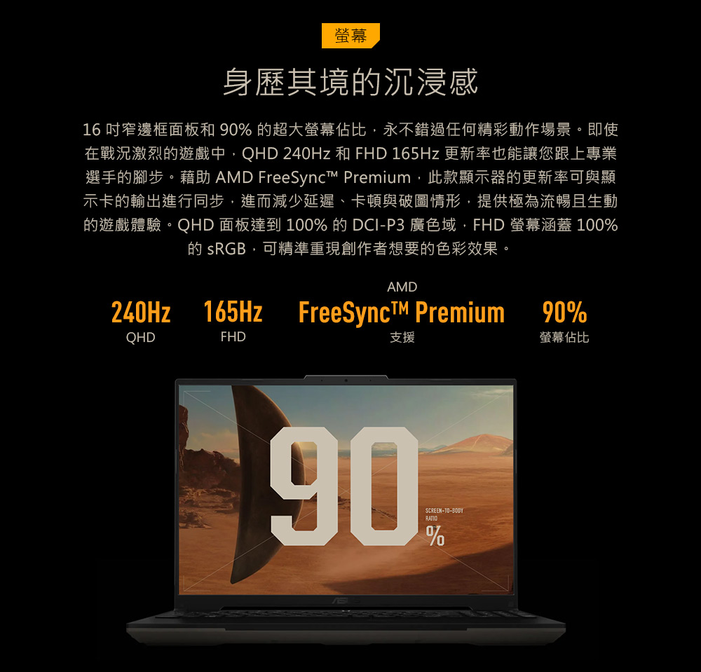 LCD:16 "(薄邊框) / FHD+ 16:10 (1920 x 1200, WUXGA) / 165Hz / 3ms / IPS-level / Anti-glare / NTSC 72% / SRGB 100% / FreeSync