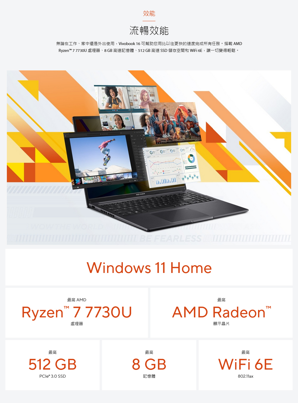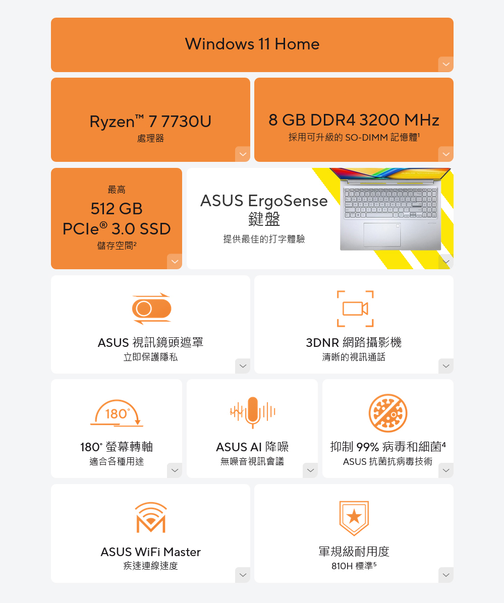 特色:視訊鏡頭遮罩 / AMD 最新七代 CPU / 有 PD充電 特色:180° 螢幕轉軸 / ASUS抗菌處理技術99%抑菌效果 處理器:AMD R7 7730U Processor 2.0GHz 液晶尺寸/記憶體:16吋 IPS (1920 x 1200) 16:10 / 8GB DDR4 on board (1 slot for upgrade) 硬碟容量/光碟機:512GB M.2 NVMe PCIe 3.0 SSD可換不可加裝 / 無 顯示卡:AMD Radeon Graphics 重量/保固:1.88KG /2年保固/首年一次完美保固 作業系統:Windows 11 Home / Wi-Fi 6 Bluetooth 5.3