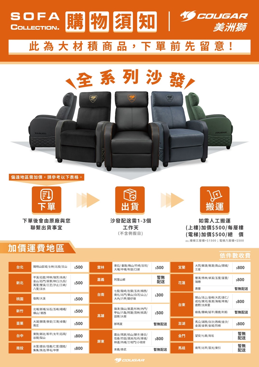 enlightened溫馨提醒 *此商品需要有DIY組裝的能力,內附產品組裝說明書,請自行斟酌對商品的組裝認知,若因組裝方式錯誤造成損壞,需自行負擔零件更換的費用 *收到商品後,請先檢查零件是否齊全無瑕疵,如有缺少零件請立即與我們反應。 *網購鑑賞期非試用期,商品經組裝後無法辦理全額退貨,將酌收整新費用。 mail線上報修/售後問題請加官方LINE:@COUGAR.TW