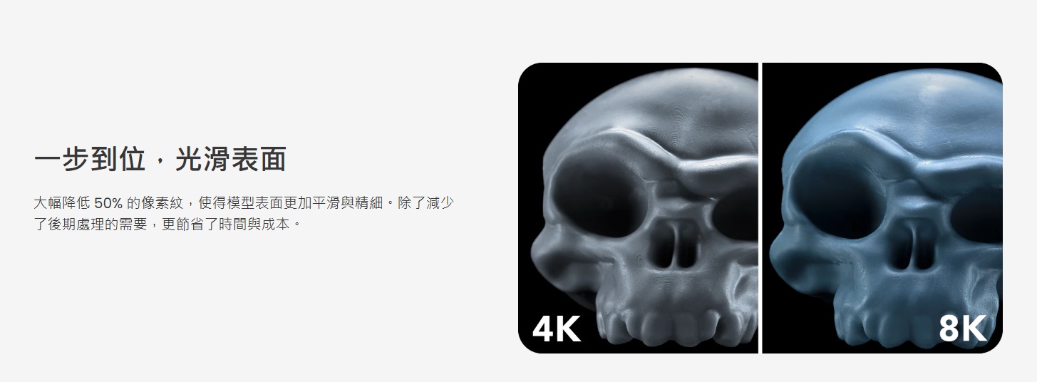 高精細 22µm 8K 解析度 最佳入門級小型列印機 輕巧設計,適合小型工作空間 創造光滑表面,層紋減少 50% 非常適合小批量迷你模型與珠寶製作