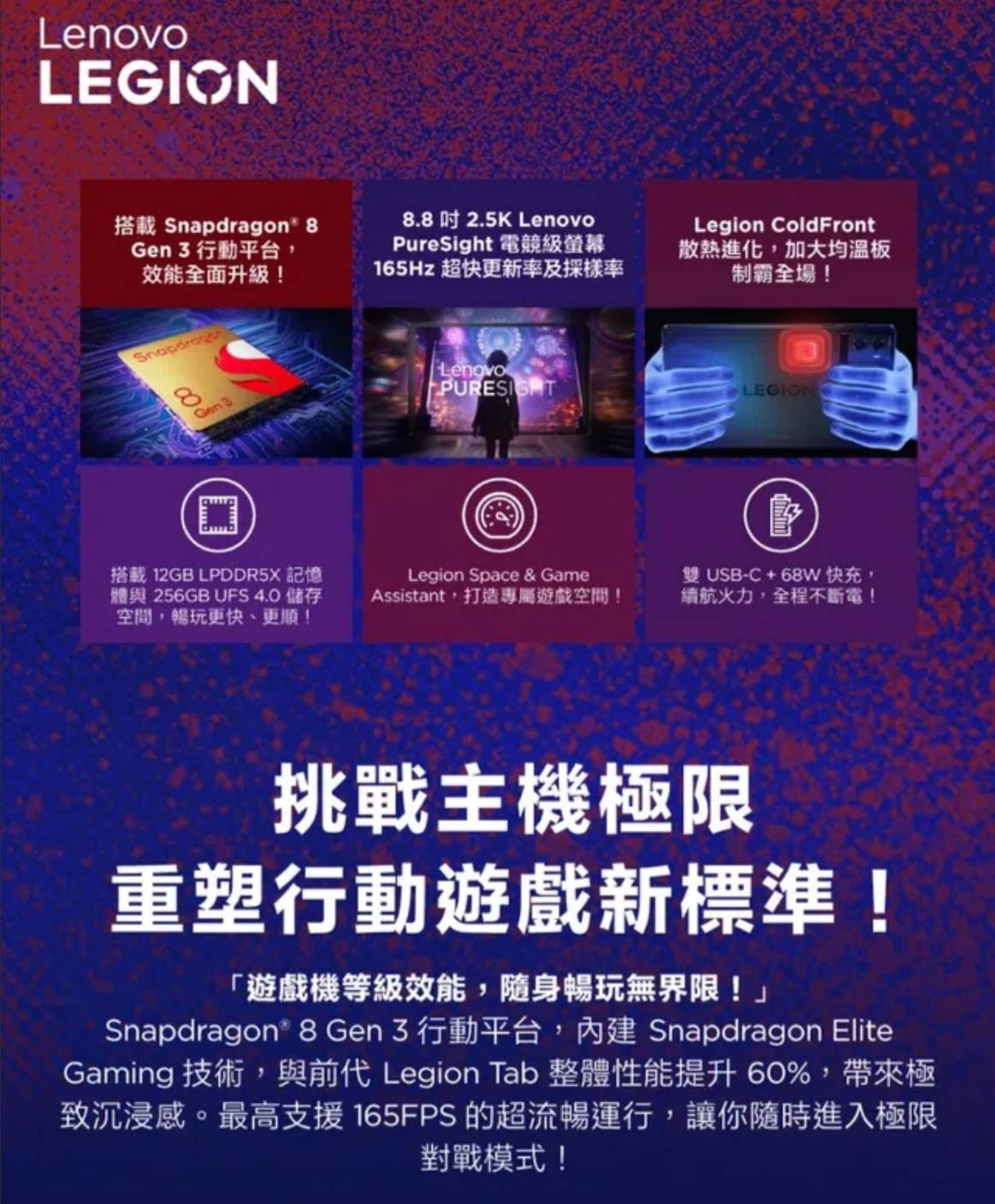 • 藉助 Snapdragon® 8 Gen 3 和 Legion ColdFront 冷卻釋放功耗和效能