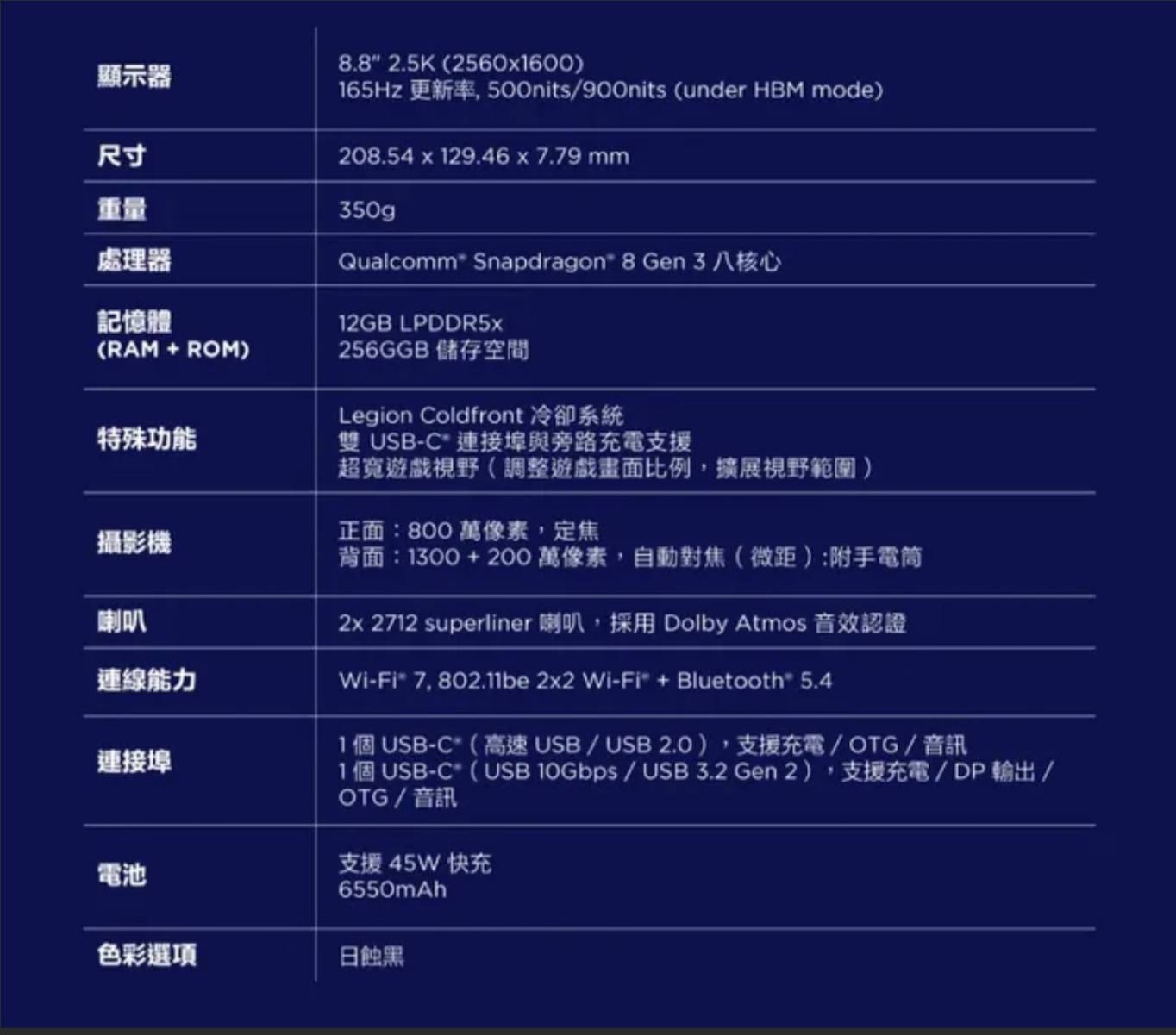 • Display8.8" 2.5K (2560 x 1600), LTPS, Touch, 500 nits, 165Hz