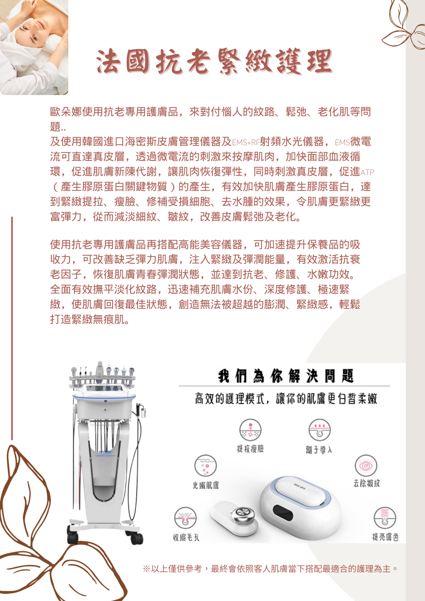 歐朵娜使用抗老專用護膚品,來對付惱人的紋路、鬆弛、老化肌等問題‥ 及使用韓國進口海密斯皮膚管理儀器及EMS+RF射頻水光儀器,EMS微電流可直達真皮層,透過微電流的刺激來按摩肌肉,加快面部血液循環,促進肌膚新陳代謝,讓肌肉恢復彈性,同時刺激真皮層,促進ATP(產生膠原蛋白關鍵物質)的產生,有效加快肌膚產生膠原蛋白,達到緊緻提拉、瘦臉、修補受損細胞、去水腫的效果,令肌膚更緊緻更富彈力,從而減淡細紋、皺紋,改善皮膚鬆弛及老化。