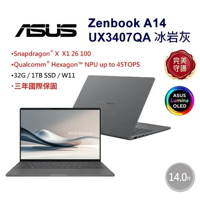 TOP14 ASUS 華碩Zenbook A14 14吋AI輕薄OLED筆電灰色(Snapdragon X X1 26 100/32GB/1TB/WIN11/UX3407QA-0082G26100)