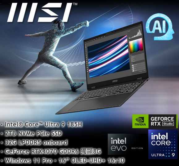 Intel® Evo™ 搭載Intel® Core™ Ultra 9 處理器185H 搭載 GeForce RTX™ 4070 8GB GDDR6筆記型電腦GPU 16吋UHD+ (3840 x 2400),OLED面板 / Windows 11 Pro Win11 文書 影音軟體 YT去廣告 原廠兩年保固