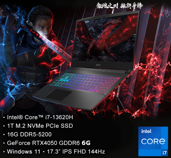 搭載 Intel® Core™ i7-13620H 處理器 搭載GeForce RTX™ 4050 6GB GDDR6筆記型電腦GPU 17.3吋Full HD (1920x1080),144Hz更新率, IPS等級電競面板 Win11 文書 影音軟體 YT去廣告 原廠兩年保固
