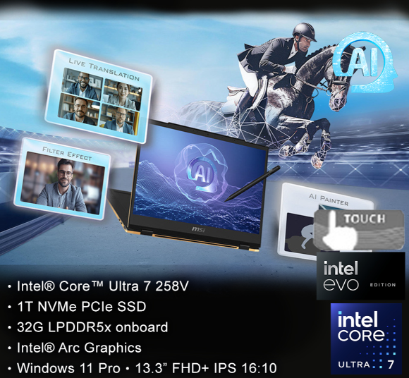 搭載最新 Intel® Core™ Ultra 7 處理器 258V 搭載Intel® Arc™ 顯示卡 13.3吋 FHD+ (1920x1200) , 觸控面板, 支援MSI Pen 2 Win11 文書 影音軟體 YT去廣告 原廠兩年保固