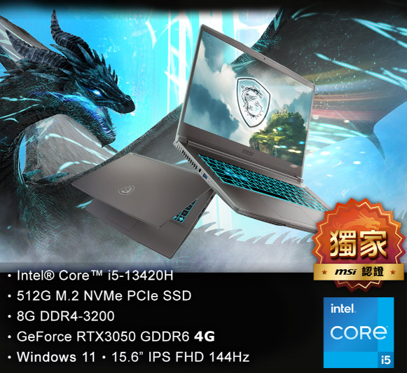 搭載第13代 Intel® Core™ i5-13420H 處理器 搭載 NVIDIA® GeForce RTX™ 3050 筆記型電腦GPU 4GB GDDR6 15.6吋 Full HD (1920x1080), 144Hz更新率, IPS等級面板 Win11 文書 影音軟體 YT去廣告 原廠兩年保固