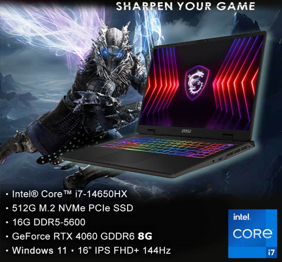 搭載 Intel® Core™ i7 處理器 14650HX 搭載 GeForce RTX™ 4060 筆記型電腦 GPU 8GB GDDR6 16吋 FHD+(1920 x 1200), 144Hz 更新率, 100% sRGB, IPS等級電競面板 Win11 文書 影音軟體 YT去廣告 原廠兩年保固