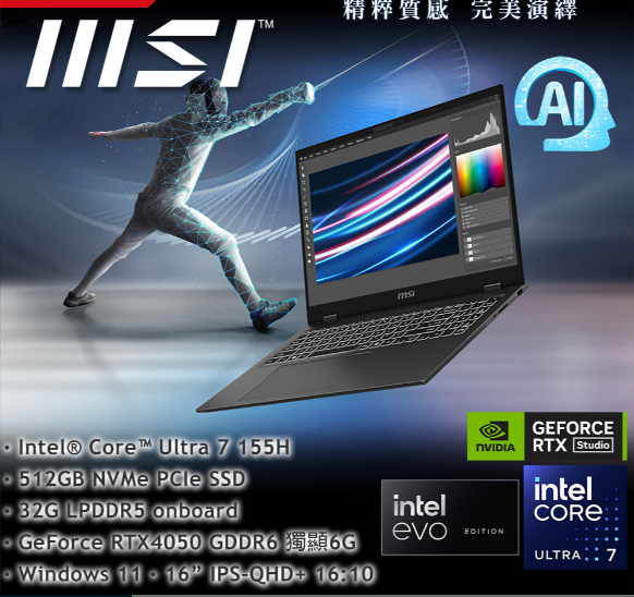 Intel® Evo™ 搭載Intel® Core™ Ultra 7 處理器155H 搭載 GeForce RTX™ 4050 6GB GDDR6筆記型電腦GPU 16吋QHD+ (2560x1600) 16:10黃金比例, 100% DCI-P3色域範圍, 400nits, IPS等級面板 Win11 文書 影音軟體 YT去廣告 原廠兩年保固